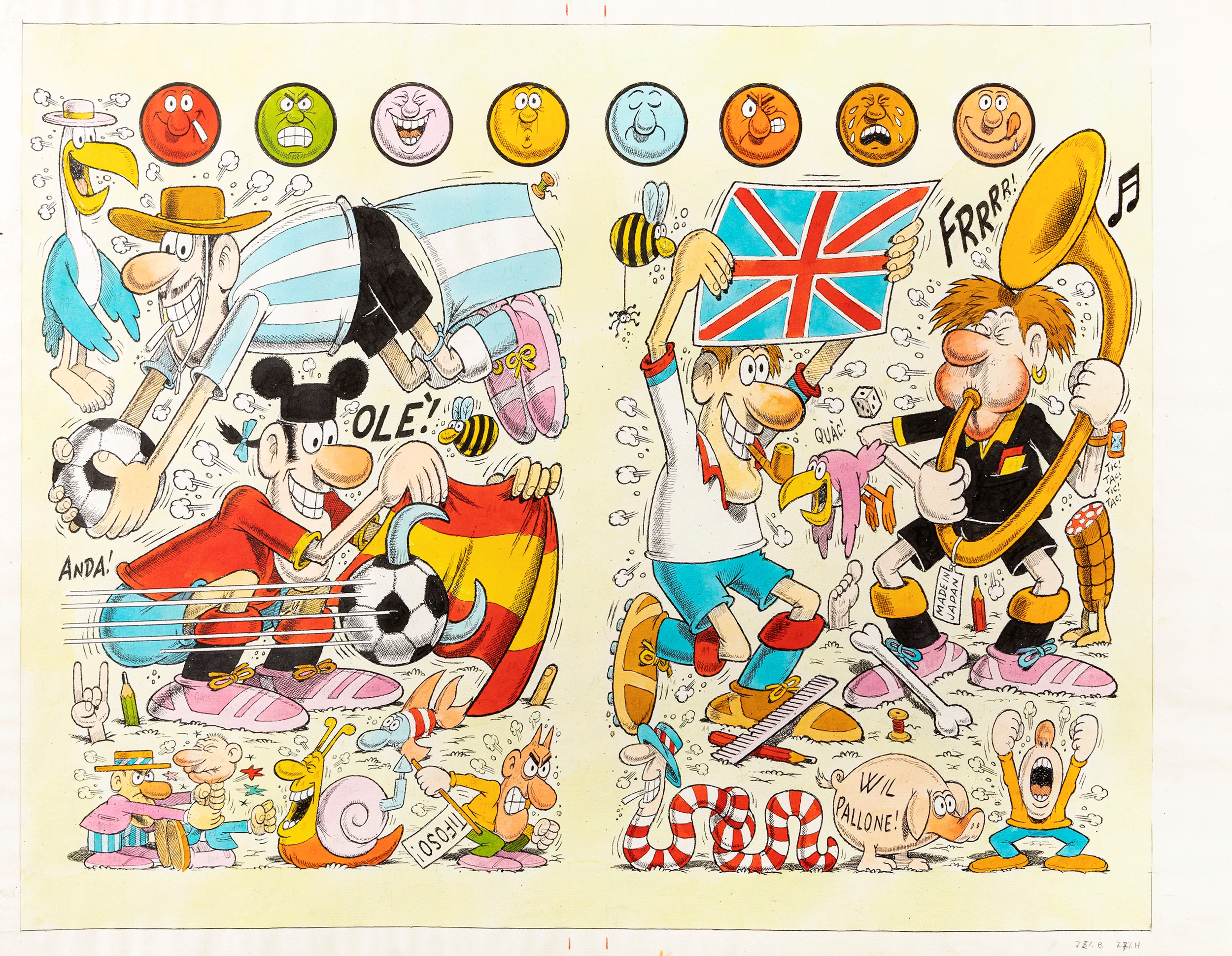matita, china e ecoline su cartoncino, 64 x 48 cm anni '80 Illustrazione originale realizzata da Jacovitti durante gli anni '80 per l'azienda napoletana Linvea, specializzata in vernici, che utilizzò questa immagine a tema calcistico per la produzione di barattoli in latta contenenti vernici professionali.