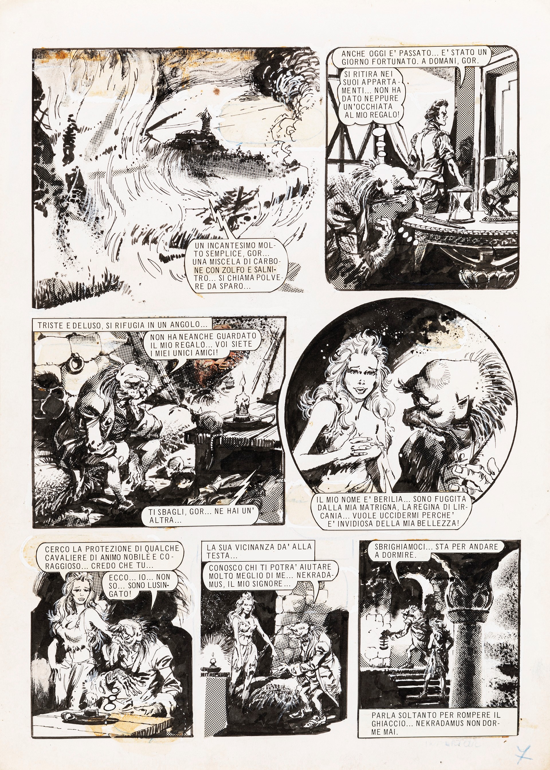 matita, china e retino su cartoncino, 29 x 40,5 cm 1976 Tavola originale realizzata da Lalia per la pag. 7 di De venenos crueles y dagas malditas, episodio della celebre saga gotica Nekradamus edita per la prima volta in Argentina su Skorpio Libro de Oro n. 2 nel dicembre del 1976. Testi di Héctor G. Oesterh