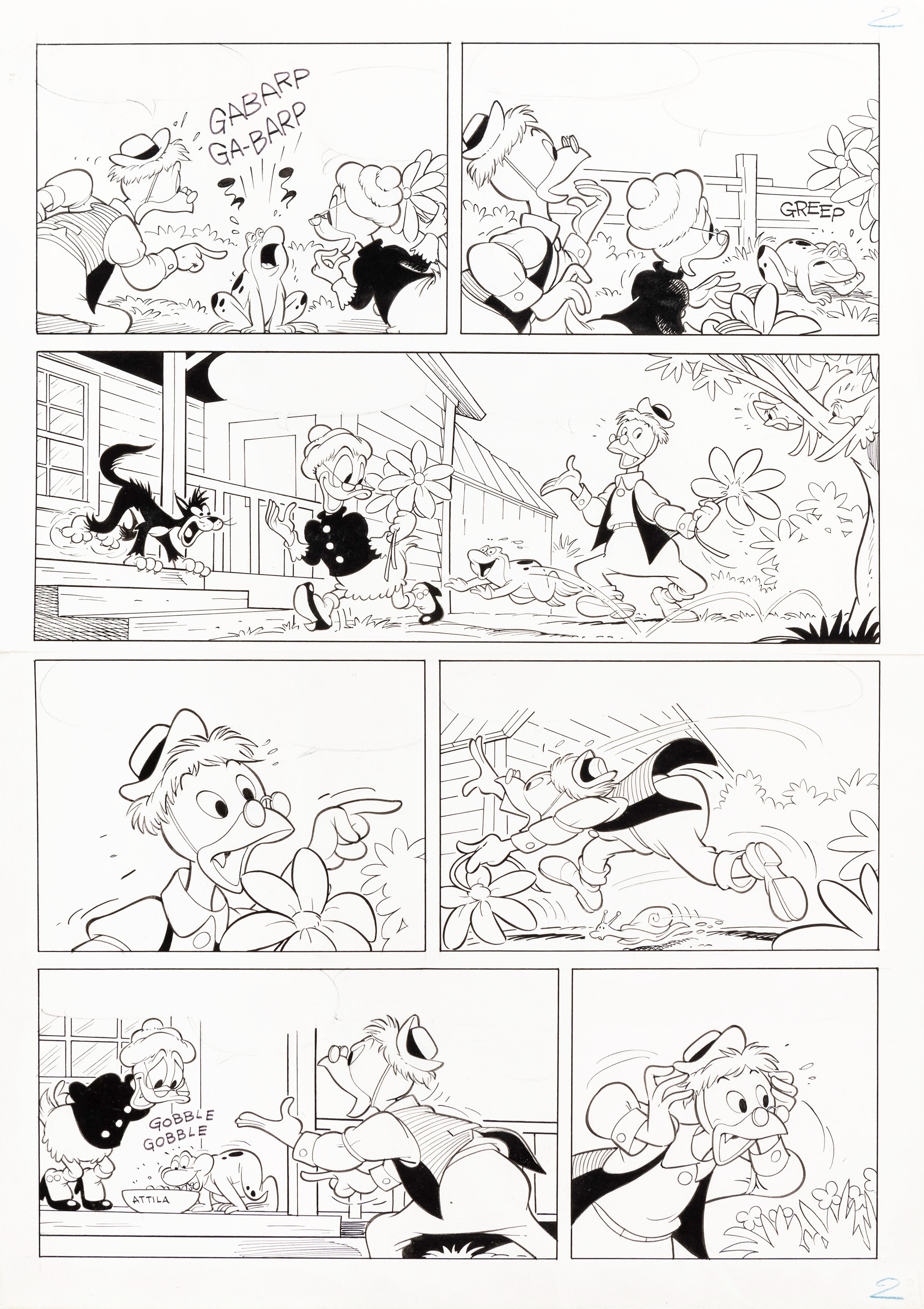 matita e china su cartoncino, 32 x 45 cm Tavola originale per Nonna Papera e il rospo da guardia tav. 2, storia di nove pagine realizzata da Scarpa negli anni '80 per il mercato statunitense. Le tavole di questa storia andarono perdute e fu impossibile pubblicarle all’epoca, ma, dopo il loro avventuroso ritrovamento, sono state interamente stampate nel 2014 sul volume dedicato al maestro veneziano Le grandi storie Disney - L'opera omnia di Romano Scarpa, n. 40. Al retro sono presenti bozzetti a matita. Piega orizzontale al centro.