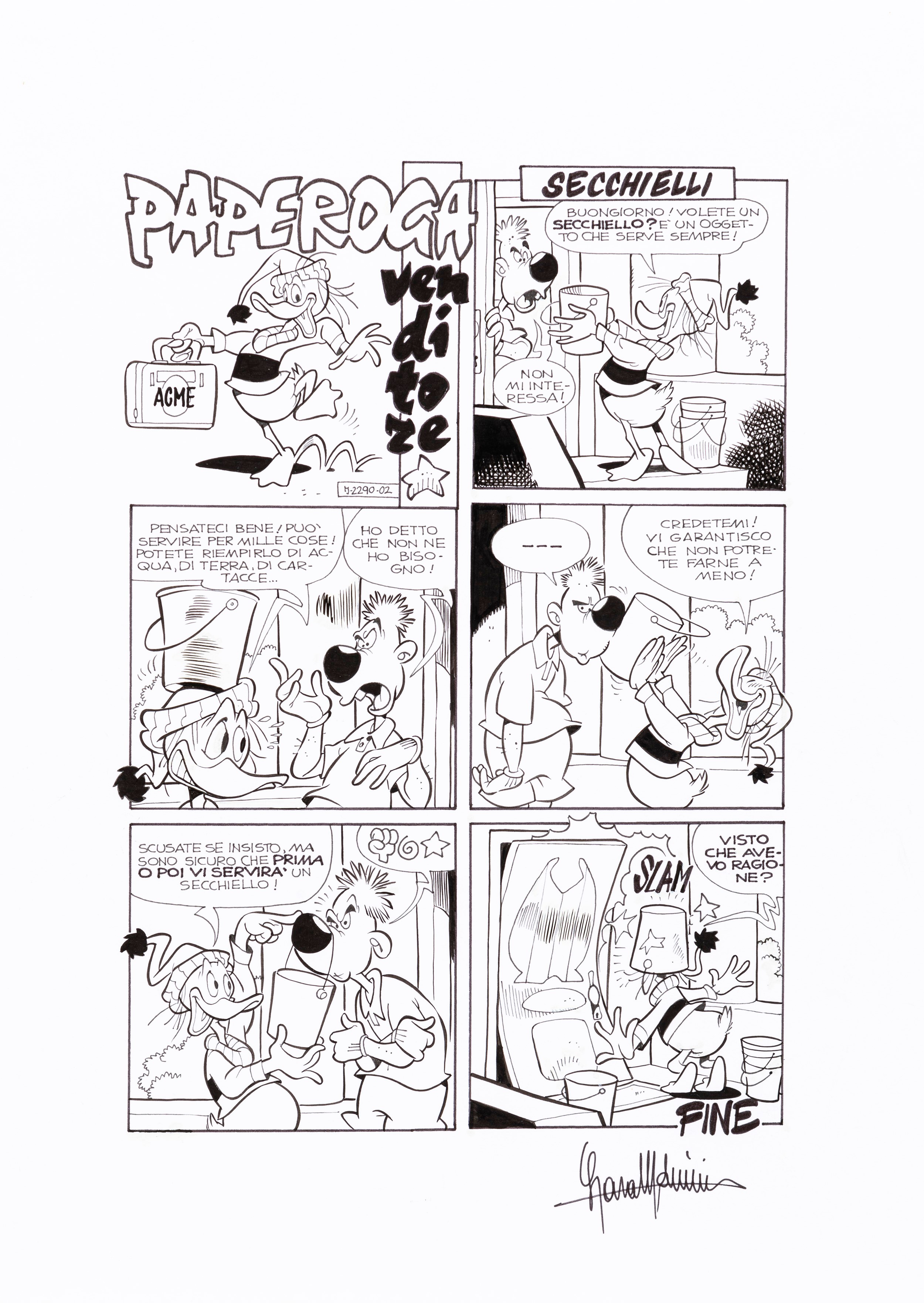 1999 Tavola originale realizzata dalla Molinari per Paperoga venditore, edita su Topolino n. 2288 nell‘Ottobre 1999. Firmata.