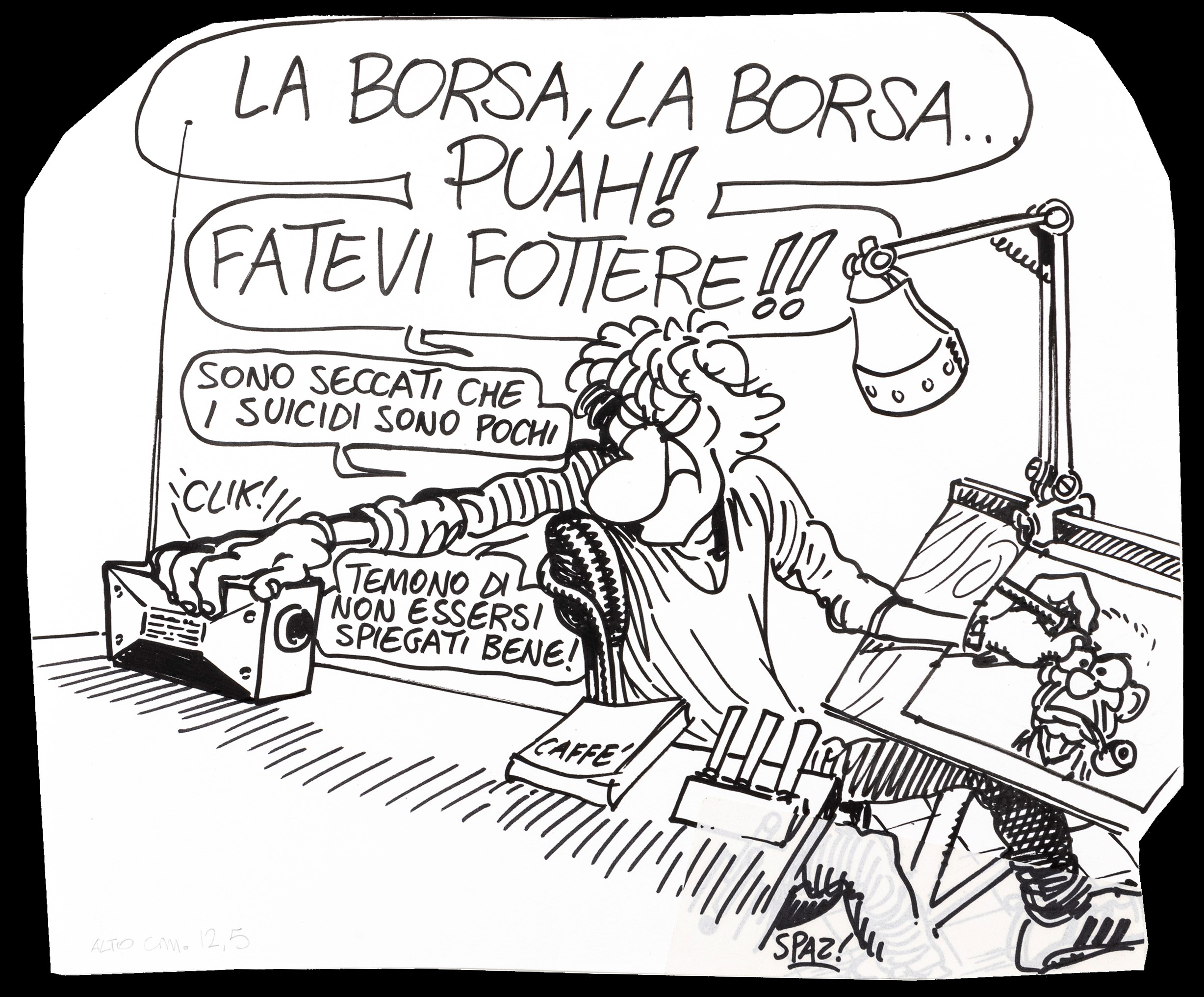 matita e china su cartoncino, 27,5 x 23 cm 1987 Illustrazione originale realizzata da Pazienza e pubblicata sulla rivista Tango n. 85 nel Novembre 1987. Opera recentemente ristampata sul volume Pertini a pag. 4 dalla Fandango Libri nel 2010. Un autoritratto di Pazienza al tavolo da disegno mentre tratteggia il volto di Pertini...entrambi piuttosto seccati. Firmata.