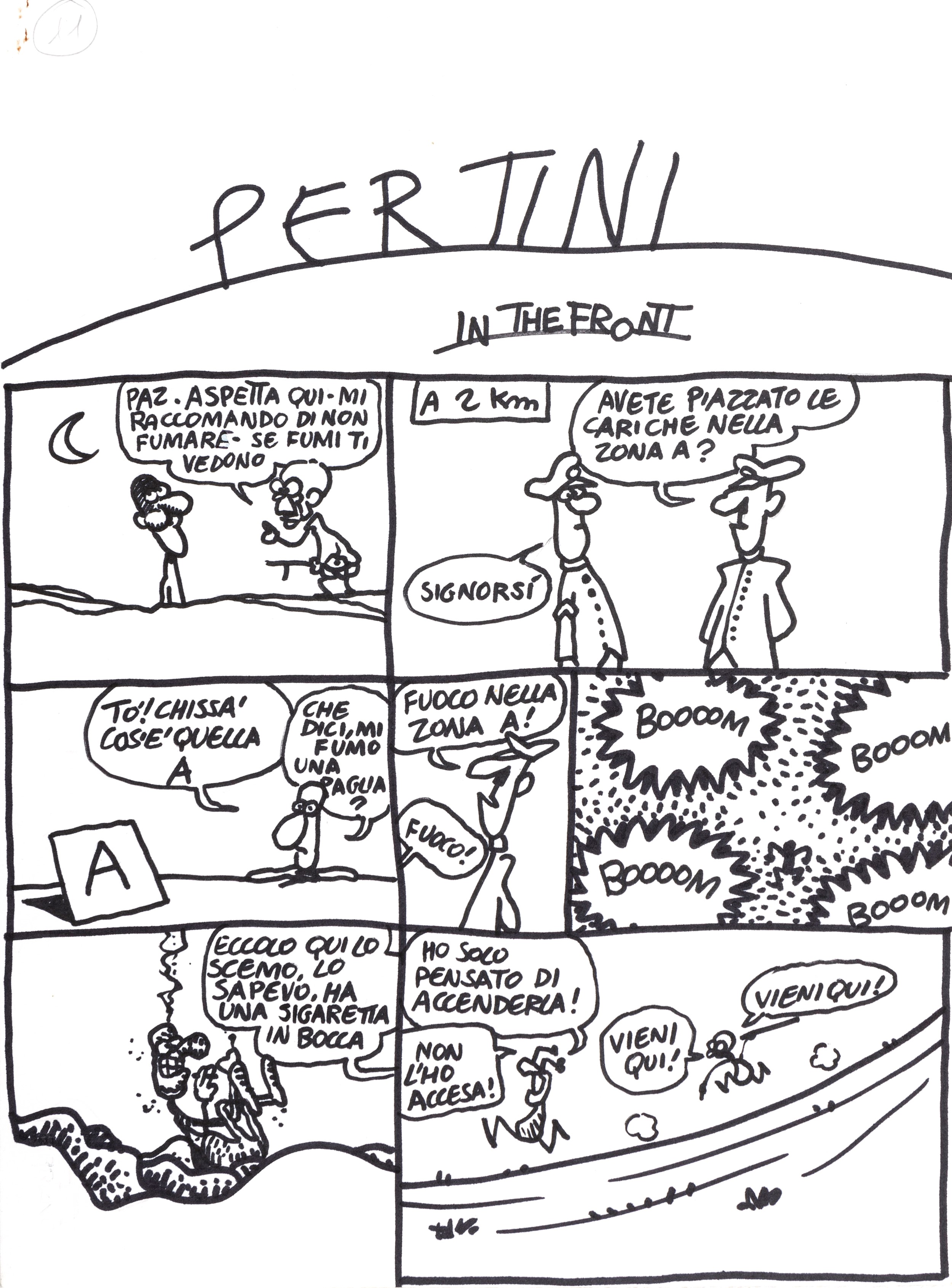1977/1981 Tavola originale realizzata da Pazienza intitolata Pertini in the front, una delle 33 tavole autoconclusive che Paz dedicò al Presidente Sandro Pertini nella sua mitica saga di Pertini il partigiano, pubblicata tra il 1977 e il 1981 durante la sua collaborazione alle riviste Il Male, Frizzer, Frigidaire e Cannibale. Un vero e proprio atto di amore di Pazienza per Pertini che lo spinse a diventare la sua spalla comica, catapultandosi con lui indietro negli anni, durante l'occupazione nazista, quando la guerra era prossima alla fine e le attività di resistenza al nazifascismo erano più intense. Sono tavole tanto semplici quanto perfette, che combinano la comicità dell'assurdo e lo slapstick in un amalgama irripetibile. Opera recentemente ristampata sul volume Pertini a pag. 17 dalla Fandango Libri nel 2010.