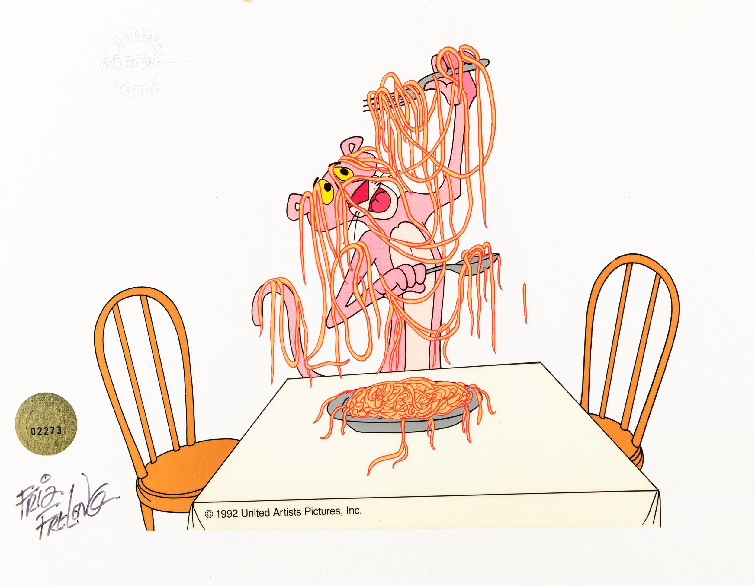 1992 Sericel a colori della Pantera Rosa con timbro di autenticità, firmata dal suo creatore Friz Freleng. Firmata.