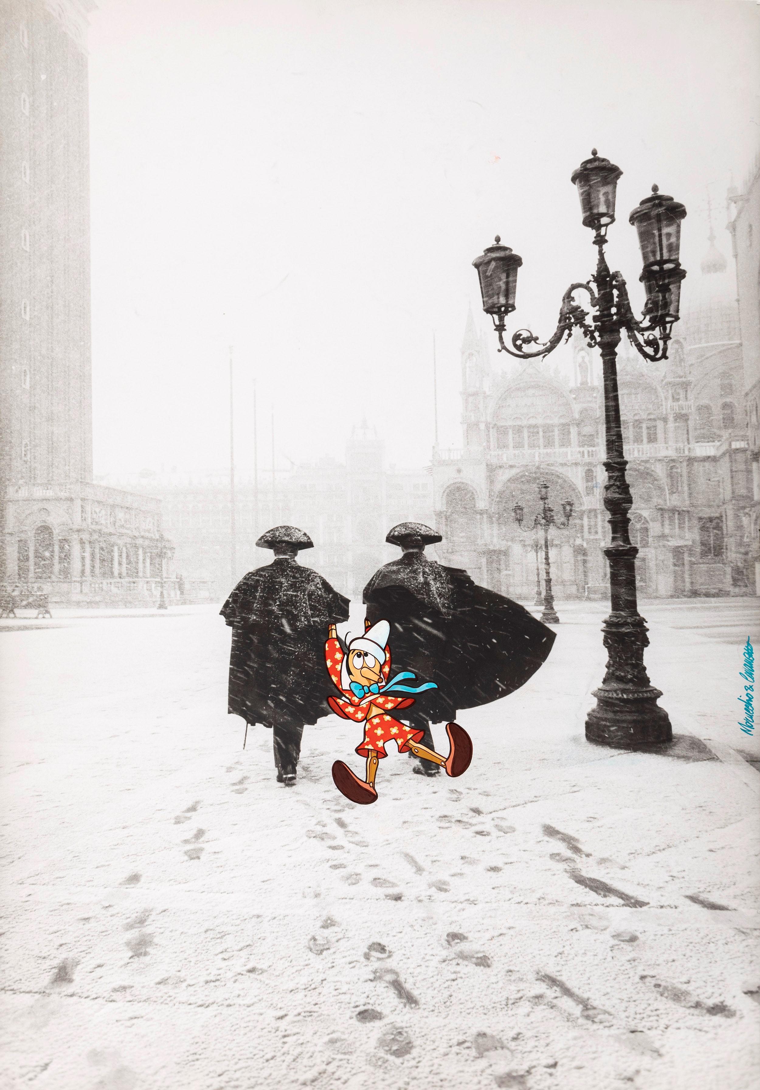 tempera su stampa fotografica, 41 x 61 cm 1991 Illustrazione originale realizzata da Cavazzano su un celebre scatto del fotografo Lorenzo Morucchio in occasione della mostra Pinocchio dal mondo, tenutasi a Padova tra l'Aprile e il Giugno del 1991, pubblicata sull´omonimo catalogo a pag. 41 dalla Editoriale Programma. Opera utilizzata come copertina del volume Le aventure de Pinochio: a Venexia e in venexian dal toscàn de Carlo Collodi edito da Helvetia nel 2019. Firmata da entrambi gli autori.