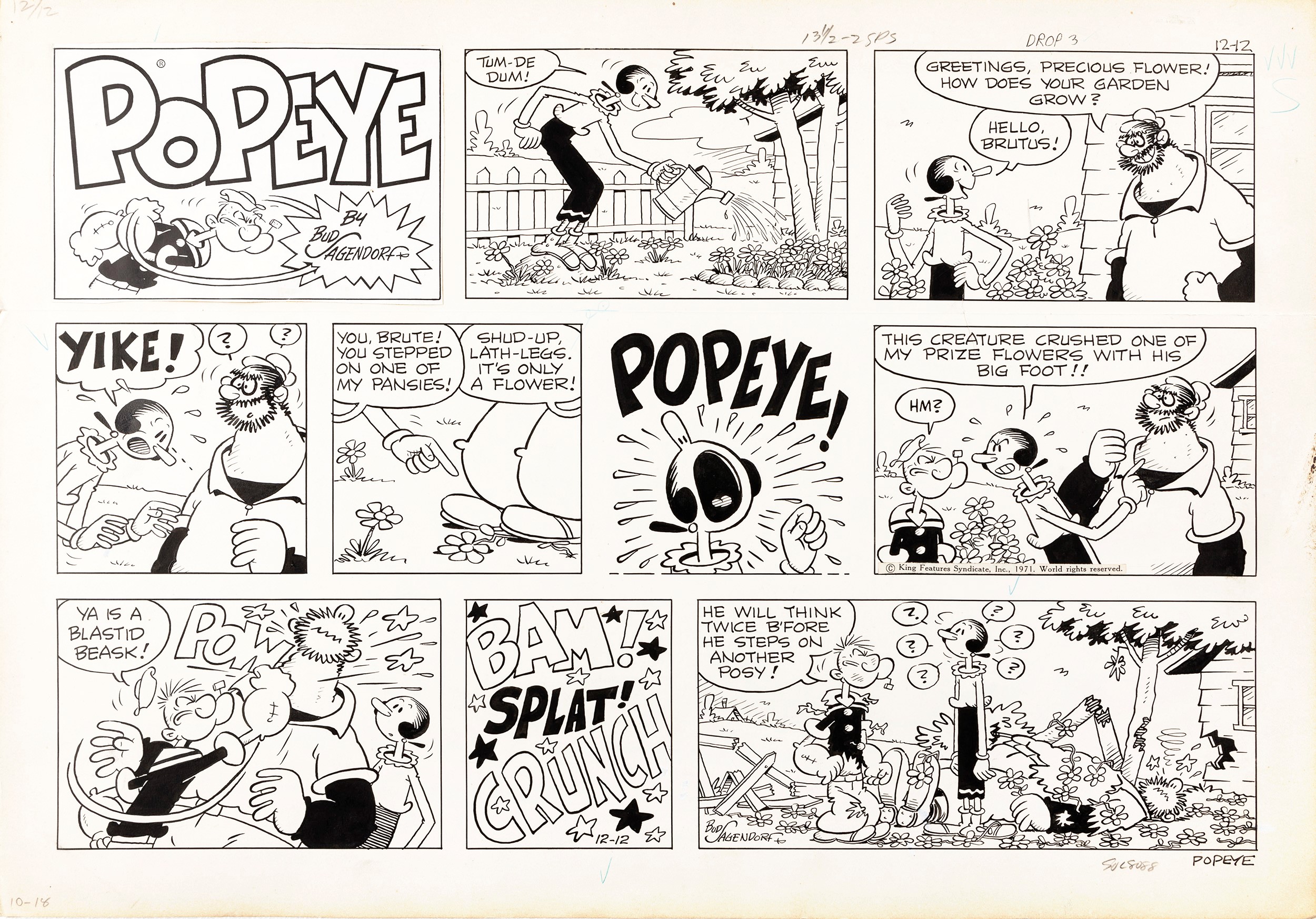 1971 Tavola domenicale del 12/12/1971 per Popeye. Piega orizzontale al centro. Firmata e datata.