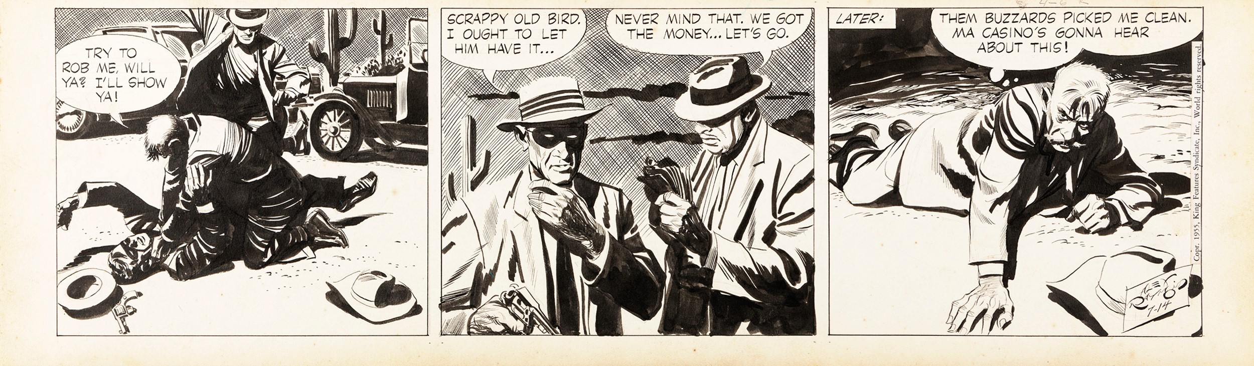 1955 Striscia giornaliera del 14/07/1955 per Rip Kirby. Una rara e affascinante strip notturna, il fiore all'occhiello di Raymond. Firmata e datata.