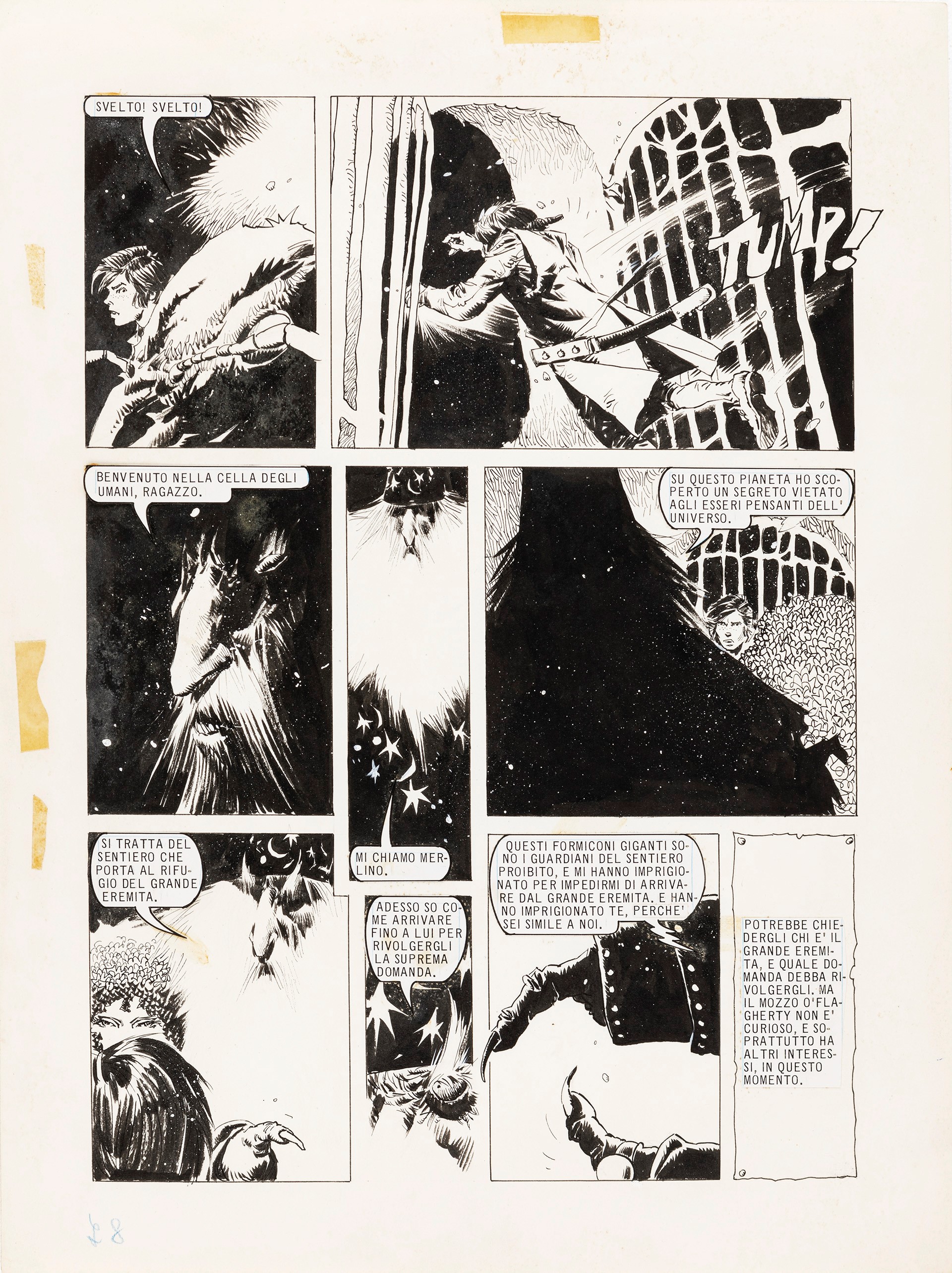 matita e china su cartoncino, 31 x 41,5 cm 1978 Tavola originale realizzata da Breccia per il cap. 7 pag. 4 della celebre saga fantascientifica Robin delle stelle, pubblicata per la prima volta in Italia sulla rivista Lanciostory n. 42 dalla Eura Editoriale nel 1978. Avventura ristampata in Argentin