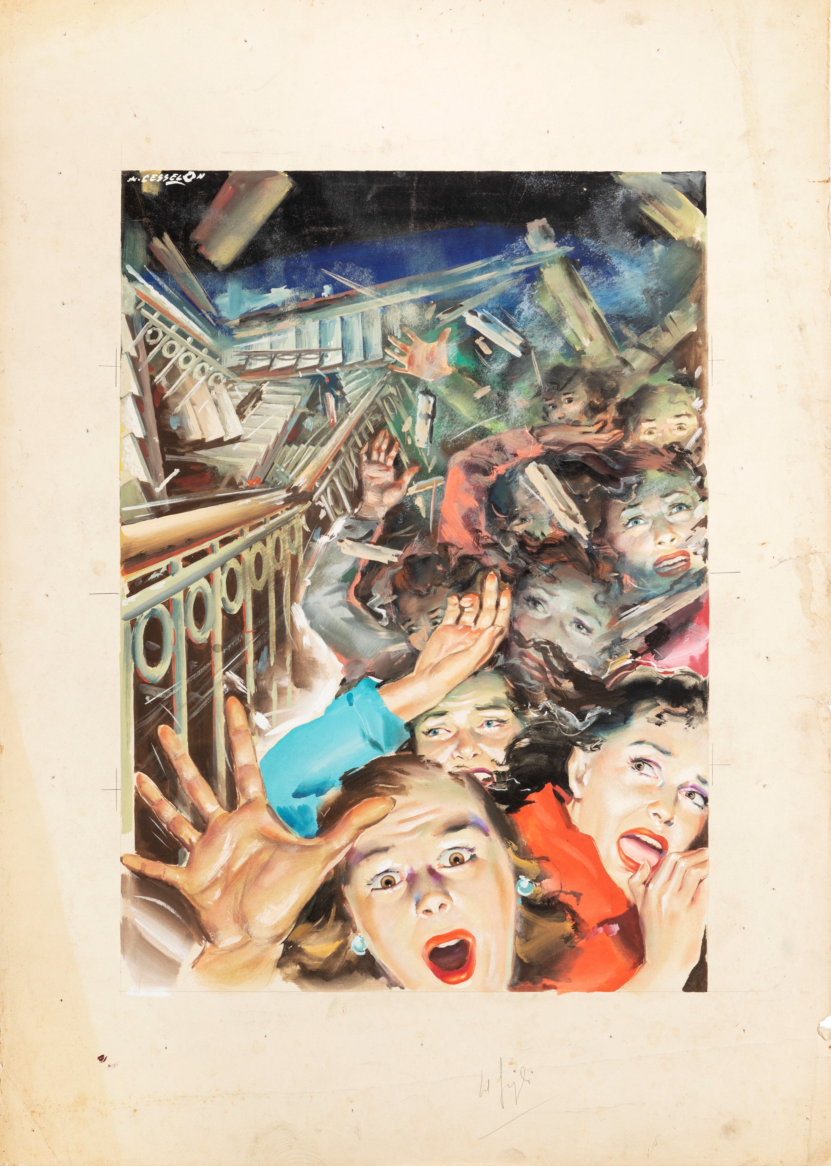 tempera su cartoncino, 70 x 100 cm 1952 Bozzetto originale realizzato da Cesselon per la locandina ufficiale del film Roma ore 11, diretto da Giuseppe De Santis con Lucia Bosè, Delia Scala e Paolo Stoppa nel 1952. Tra le opere più rappresentative del neorealismo italiano, si basa su un fatto di cronaca avvenuto a Roma nel 1951. Firmato.