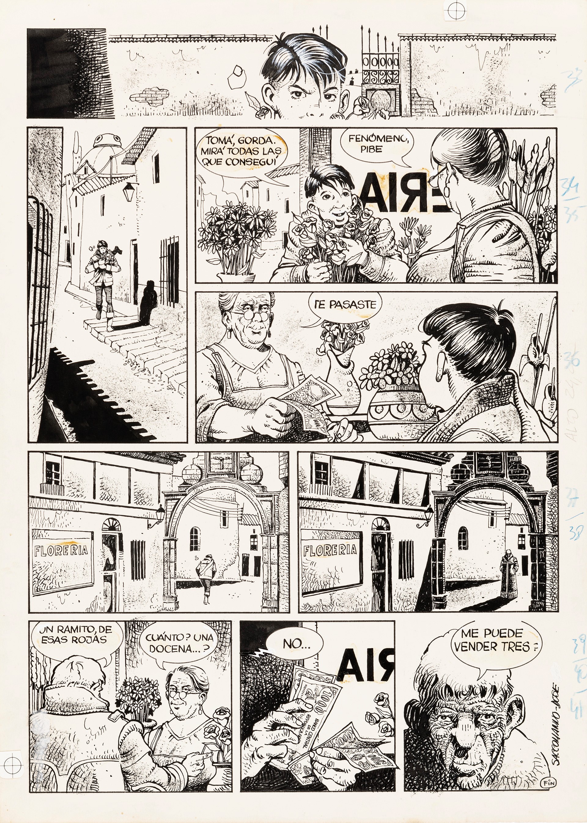 1988 Tavola originale realizzata da Dose per Rose per te, page 4 di questa storia breve edita per la prima volta in Italia su Skorpio n. 32 del 1988. Testi di Saccomanno. Firmata da entrambi gli autori.