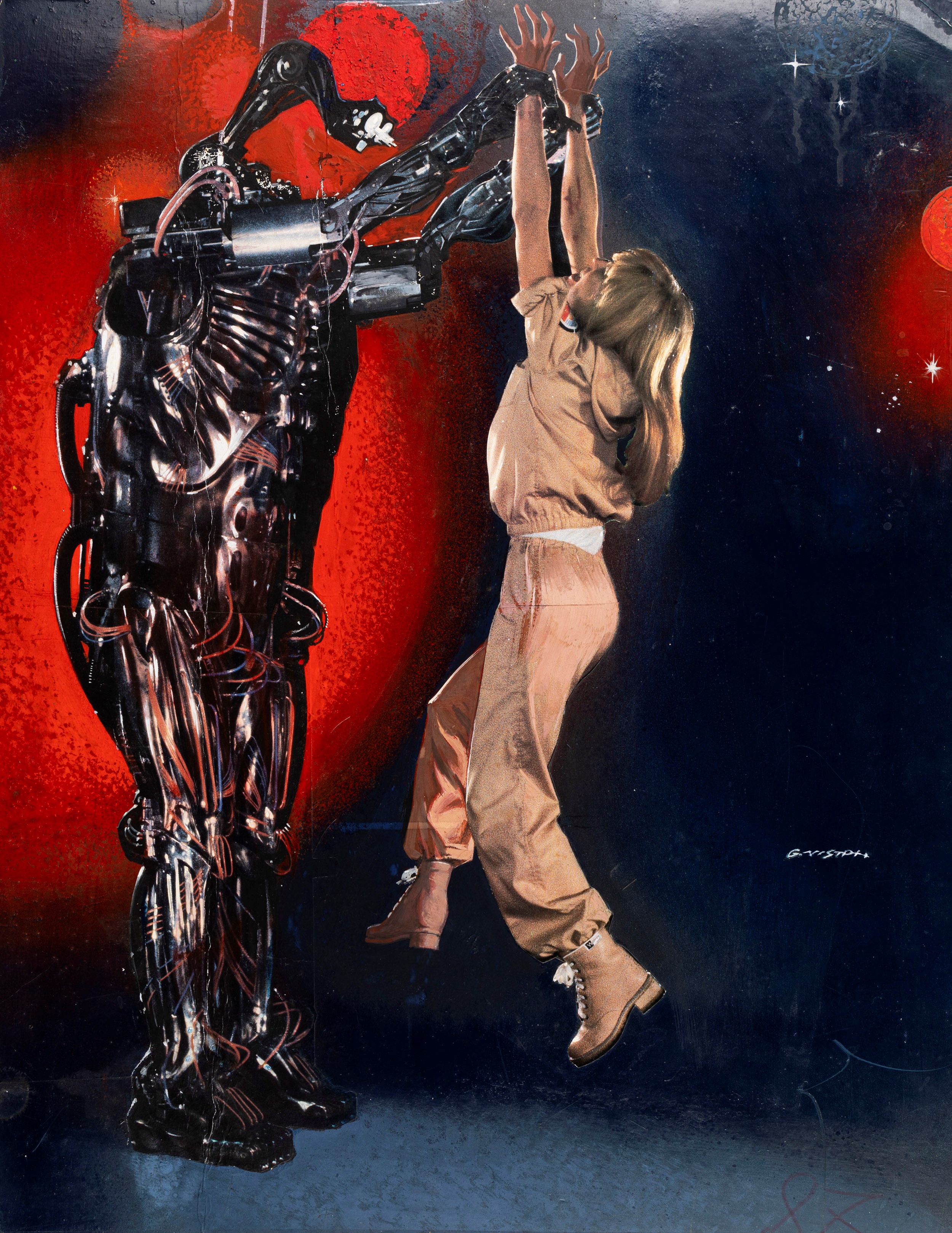 tempera e collage fotografico su cartone, 50 x 64,5 cm 1980 Bozzetto originale realizzato da Giuliano Nistri per la locandina ufficiale del film Saturn 3, diretto da Stanley Donen con Farrah Fawcett, Kirk Douglas e Harvey Keitel nel 1980. Lievi pieghe. Firmato.