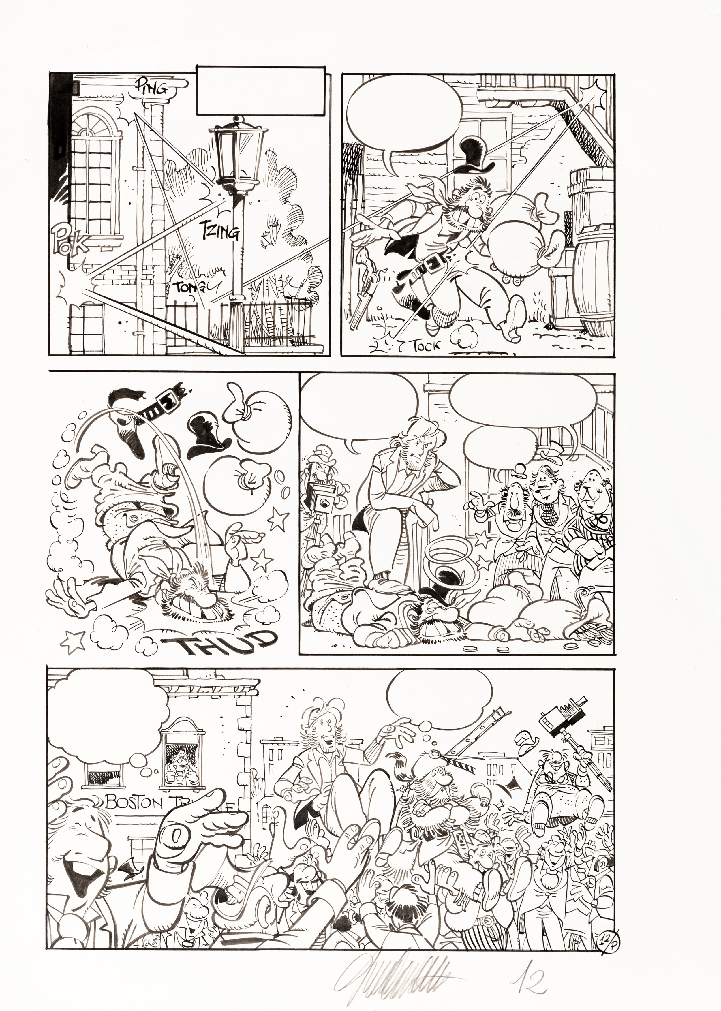 matita e china su cartoncino, 25 x 35 cm 1980 Tavola originale realizzata da Cavazzano per la pag. 12 di un'avventura di Silas Finn, personaggio creato insieme a Sclavi nel 1979 per per la rivista tedesca Zack. Silas Finn, professione reporter, e B. J. Crocker, fotografo, vengono inviati nel vecchio West dal direttore del Boston Tribune a caccia di notizie mirabolanti per aumentare la tiratura del giornale. Firmata.