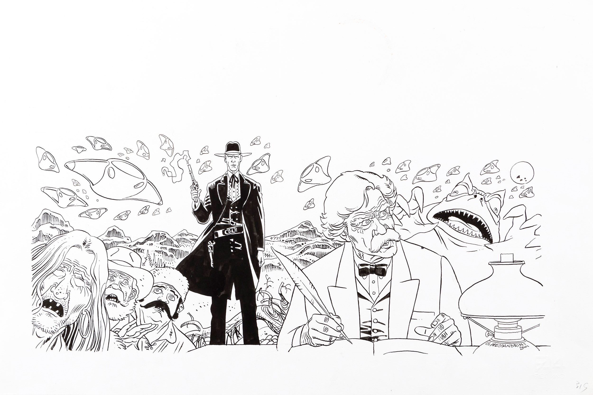 matita e china su cartoncino, 48 x 33 cm 2001 Originale di copertina (e quarta di copertina) realizzato da Alessandrini per L'uomo che raccontava storie, edito su Storie da Altrove n. 4 dalla Bonelli nel 2001. Si allega la prova colore ad acquerello. Firmato e datato.