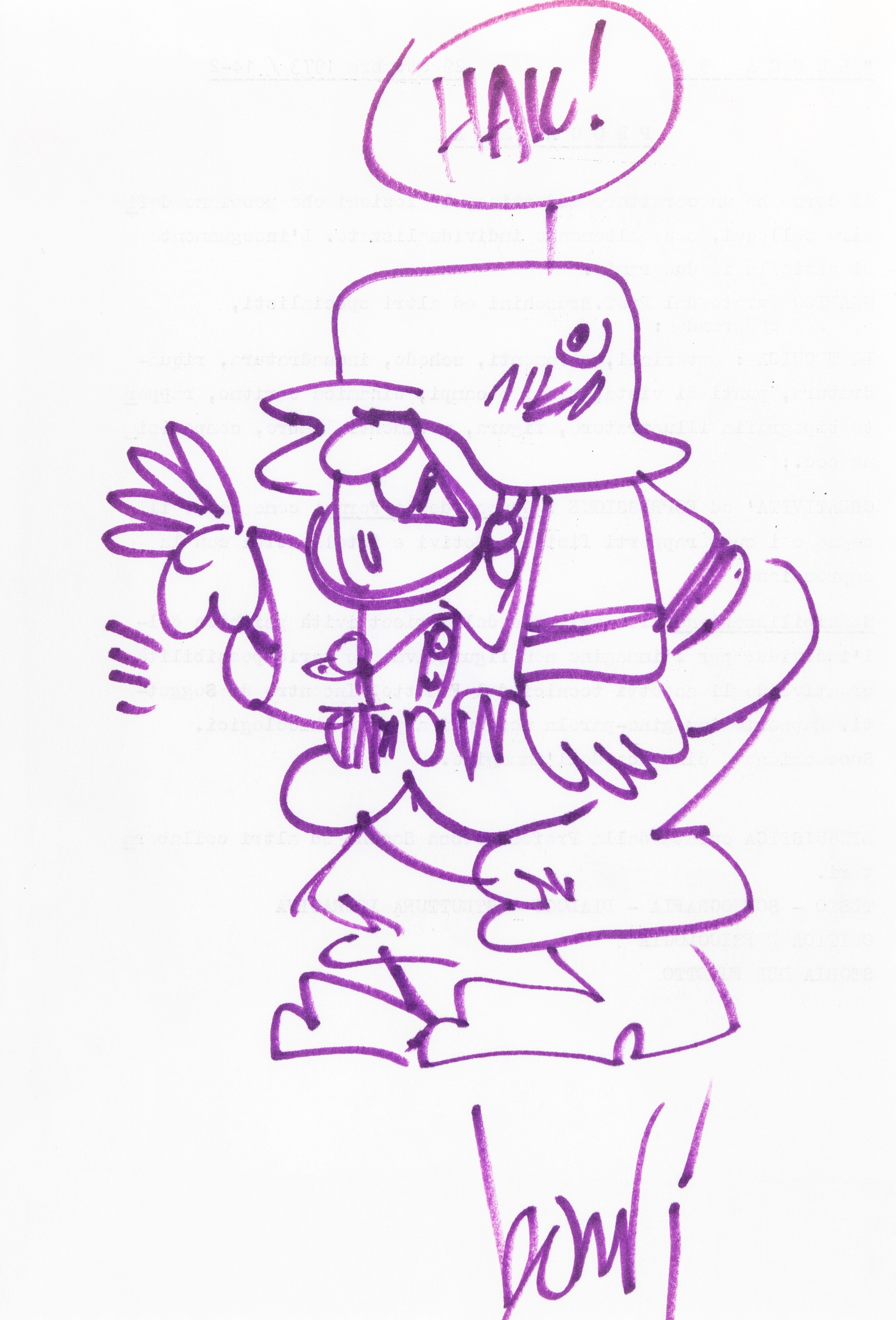 pennarello su carta, 20,5 x 29,5 cm 1973 Sketch originale realizzato da Bonvi in occasione dell'edizione di Lucca Comics del 1973. Il disegno è eseguito sul retro del programma ciclostilato del corso di fumetto tenuto dal Prof. Bruschini che si svolgeva nei giorni di Lucca 9. Proveniente dalla collezione di Saverio Bruschini (tra i fondatori della manifestazione). Firmato.