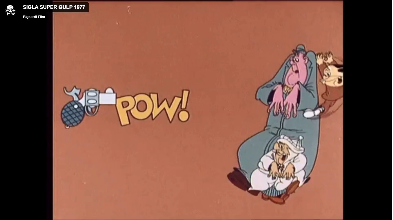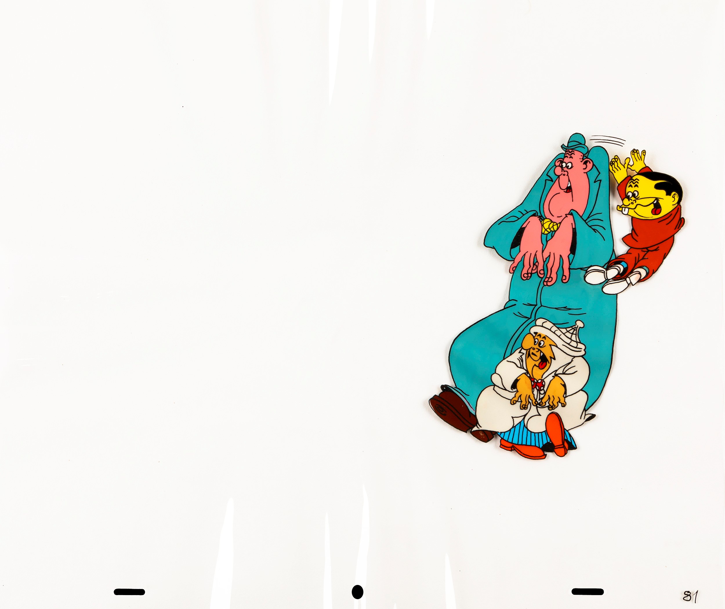 tempera su rodovetro, 32 x 27 cm 1977 Cel originale realizzata dallo Studio Bignardi per la mitica sigla di apertura della serie televisiva “SuperGulp!”. A dare il benvenuto ai piccoli telespettatori erano i presentatori della serie stessa, cioè i protagonisti di Nick Carter di Bonvi. Lievi ondulature.