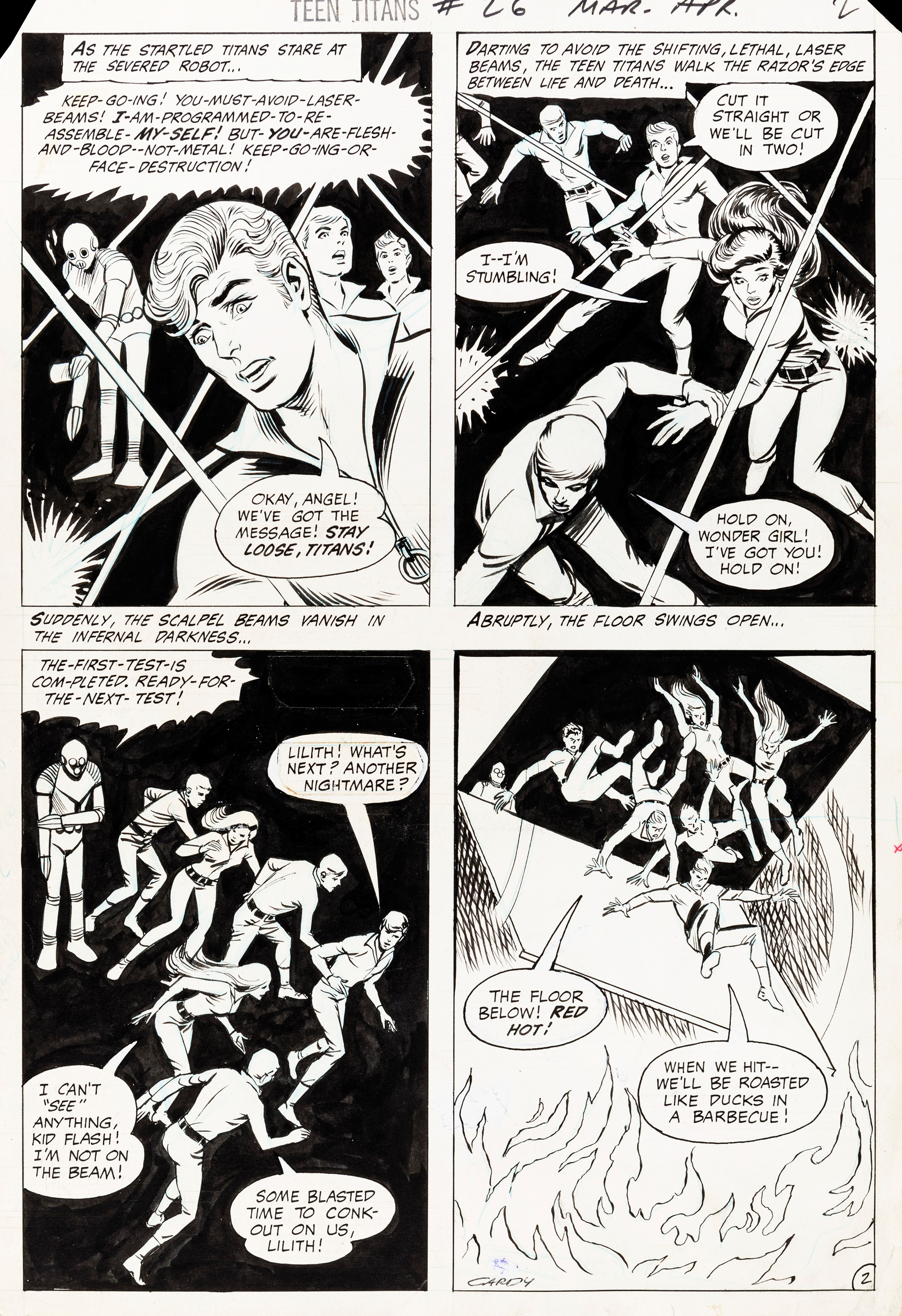 1970 Tavola originale realizzata da Cardy per A Penny for a Black Star, edita su Teen Titans n. 26 a pag. 2 dalla DC nel 1970. Lieve piega all'angolo inferiore destro. Firmata.