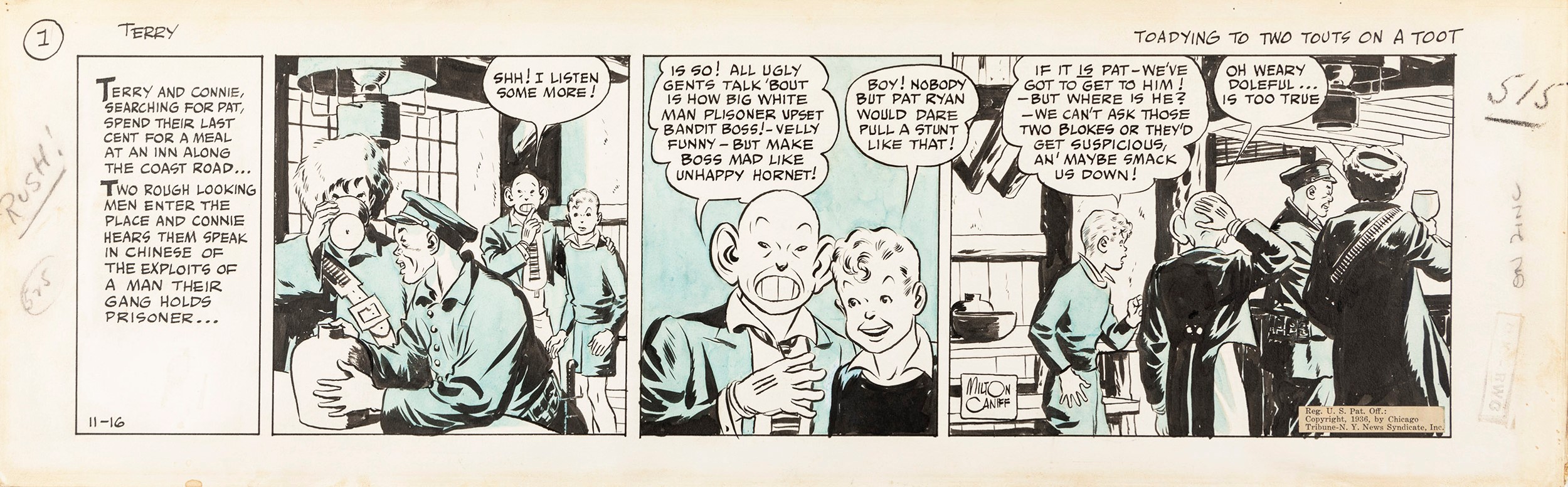 1936 Striscia giornaliera del 16/11/1936 per Terry and the Pirates, intitolata Toadying to two touts on a toot. Firmata e datata.