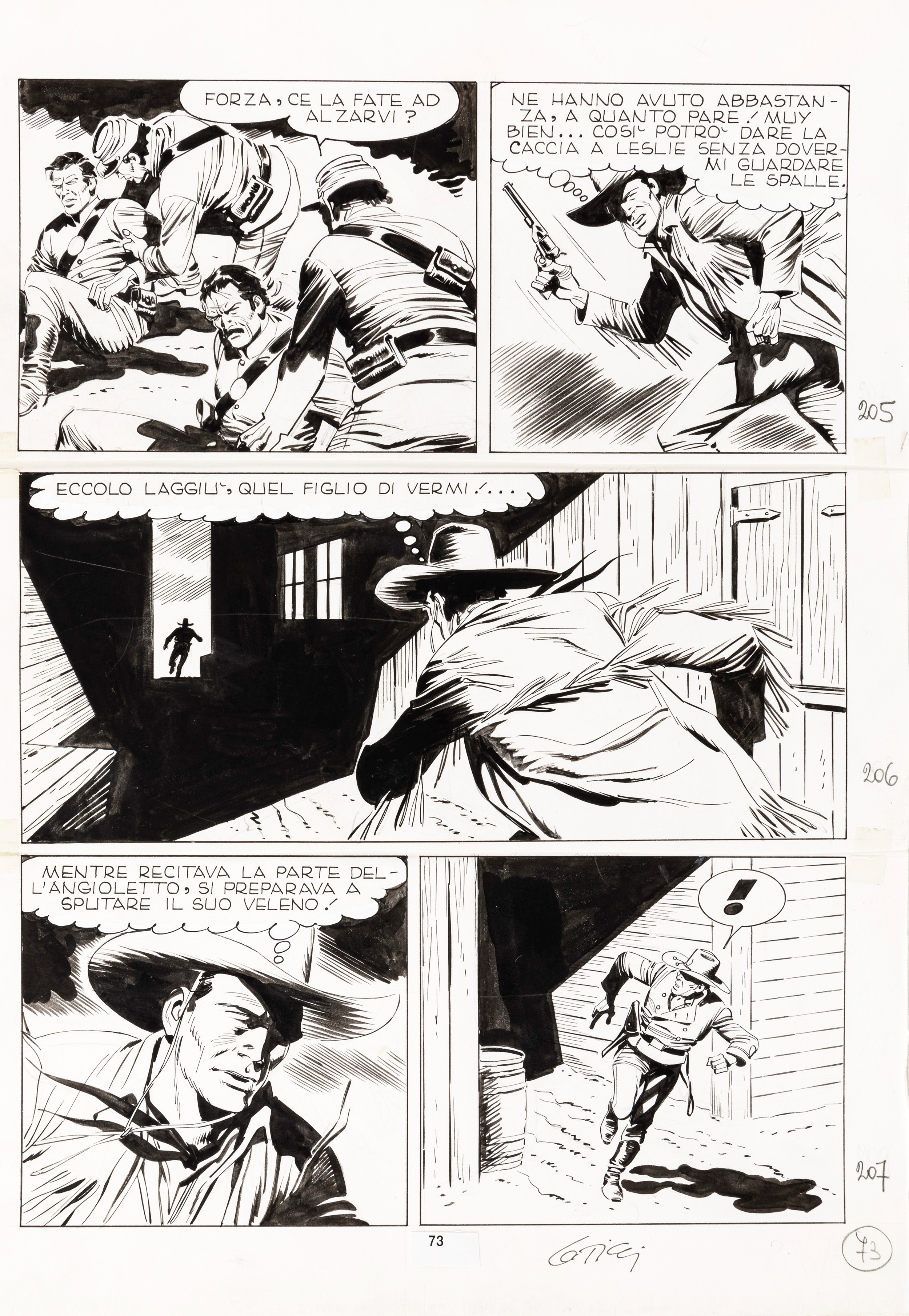 1985 Tavola originale realizzata da Ticci per Fuga da Anderville, edita su Tex n. 299 a pag. 73 dalla Bonelli nel 1985. Su tre pannelli. Firmata.