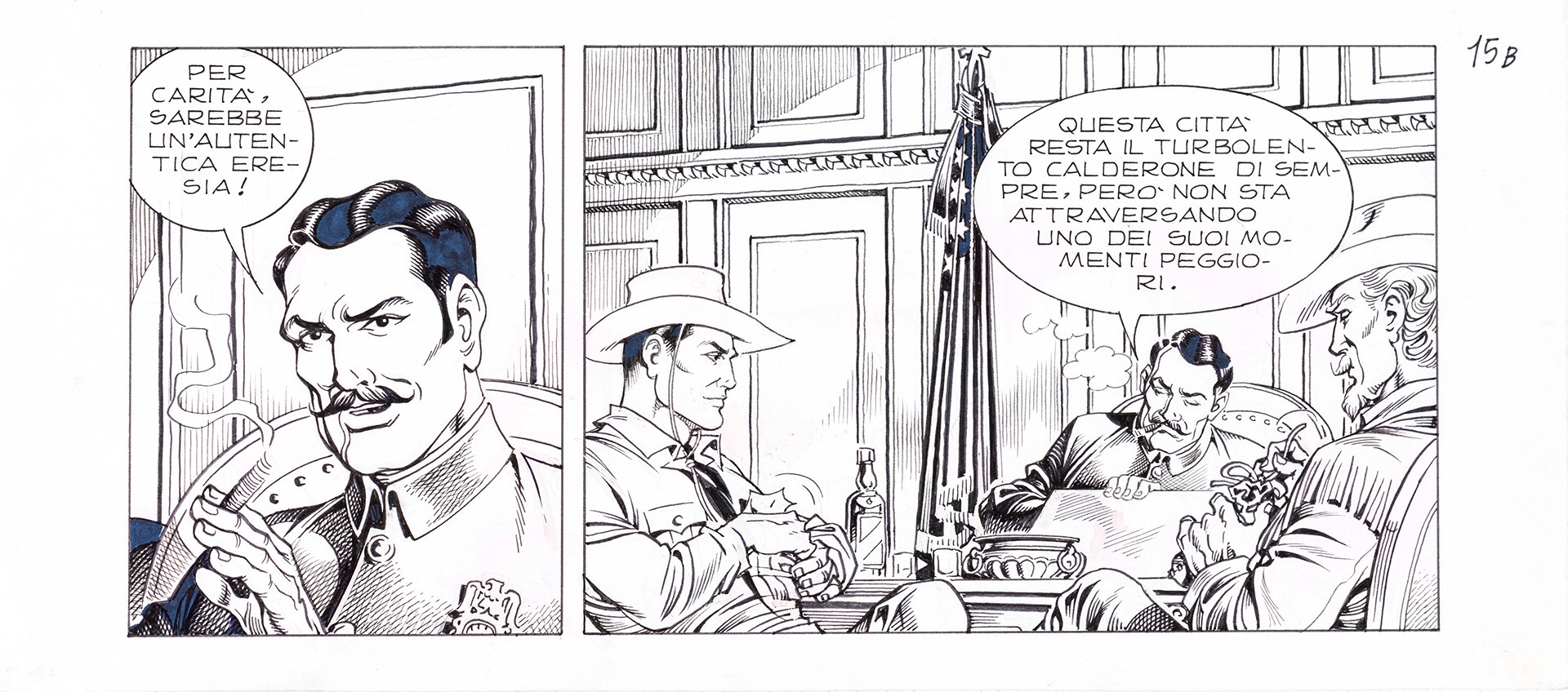 matita e china su cartoncino, 35 x 15,5 cm 1996 Striscia originale (15 B) realizzata da Magnus per il suo eterno capolavoro La valle del terrore, edita sul Texone n. 9 a pag. 15 dalla Bonelli nel 1996. Nel 1989 il maestro bolognese decise di rifugiarsi sull´Appennino Tosco Emiliano a Castel del Rio per dedicare tutto sè stesso alla realizzazione di un´opera monumentale: il suo Tex. Un lavoro lunghissimo ed estenuante per lo stesso autore, che spingerà Magnus ad un perfezionismo maniacale portandolo a ridisegnare più volte le stesse pagine alla ricerca di una perfezione impossibile da raggiungere per chiunque altro. Le tavole del Texone di Magnus non sono mai apparse sul mercato e fino ad oggi sono circolati semplici studi preparatori, Magnus decise di applicare sulla tavola definitiva una fotocopia di questa striscia poichè il pennino utilizzato aveva virato colore in alcuni punti del disegno, dandoci così la possibilità di poter custodire un pezzo di storia del fumetto mondiale. Lievi aloni rossastri causati dal viraggio della china utilizzata dall´autore.