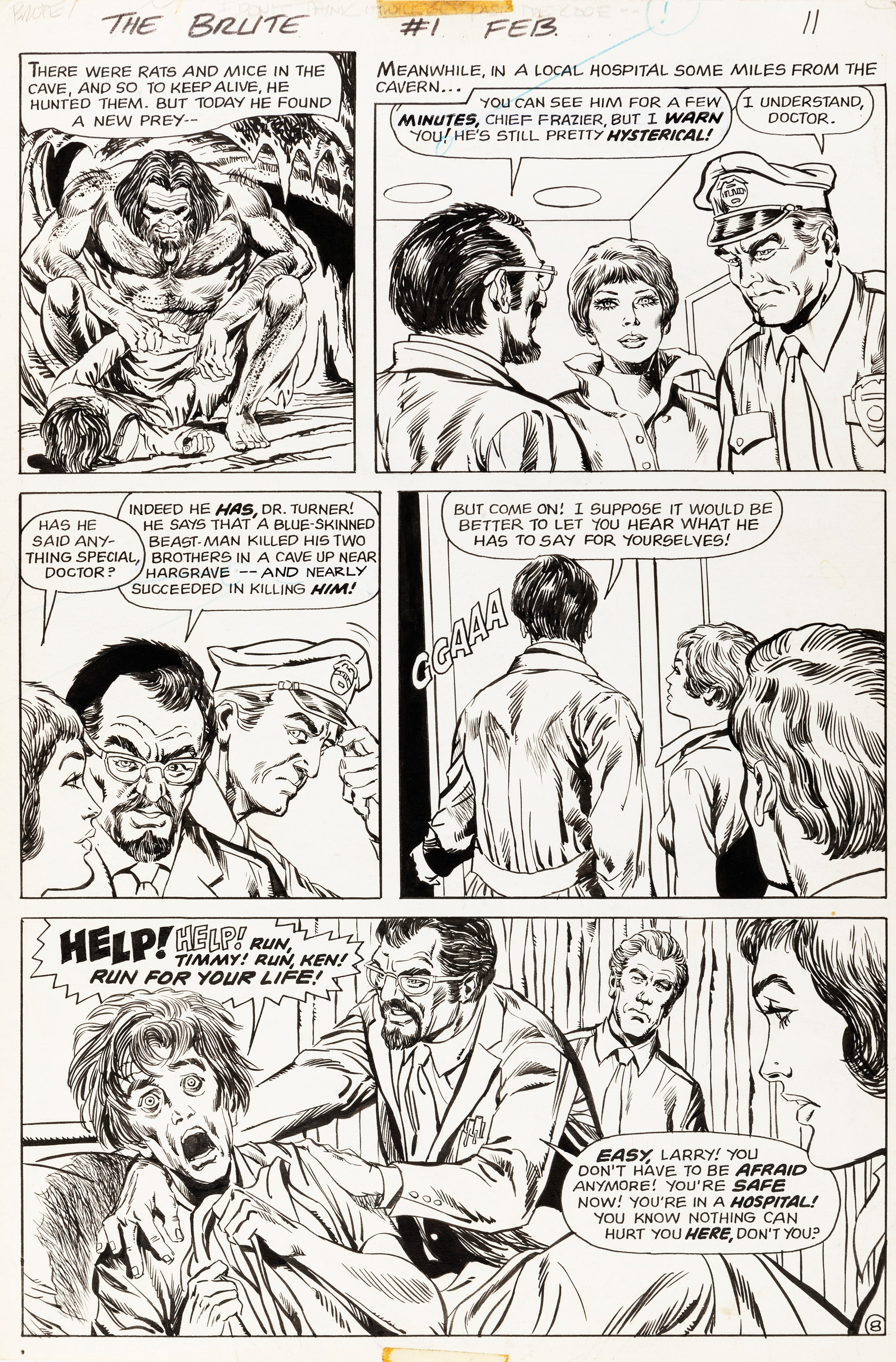 matita e china su cartoncino, 27 x 40,5 cm 1975 Tavola originale realizzata da Sekowsky per The Night of the Brute, edita su The Brute n. 1 a pag. 8 dalla Atlas nel 1975. Un gigantesco uomo di Neanderthal scongelato da un blocco di ghiaccio che va su tutte le furie nel mondo moderno...la risposta della Atlas all'Hulk della Marvel.