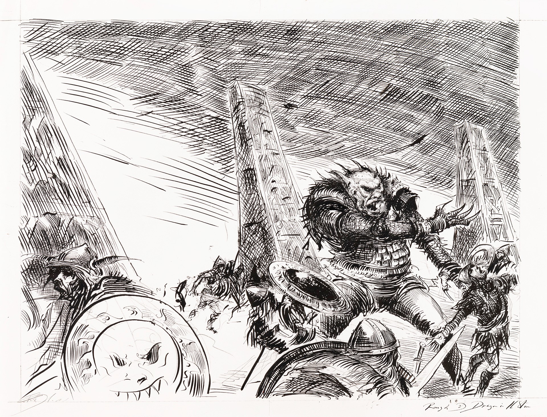 1991 Disegno preliminare realizzato da Miller per la copertina e la quarta di copertina del romanzo fantasy The Dragon in the Stone di Allan Scott, edito dalla Orbit nel 1991. Firmato e titolato.