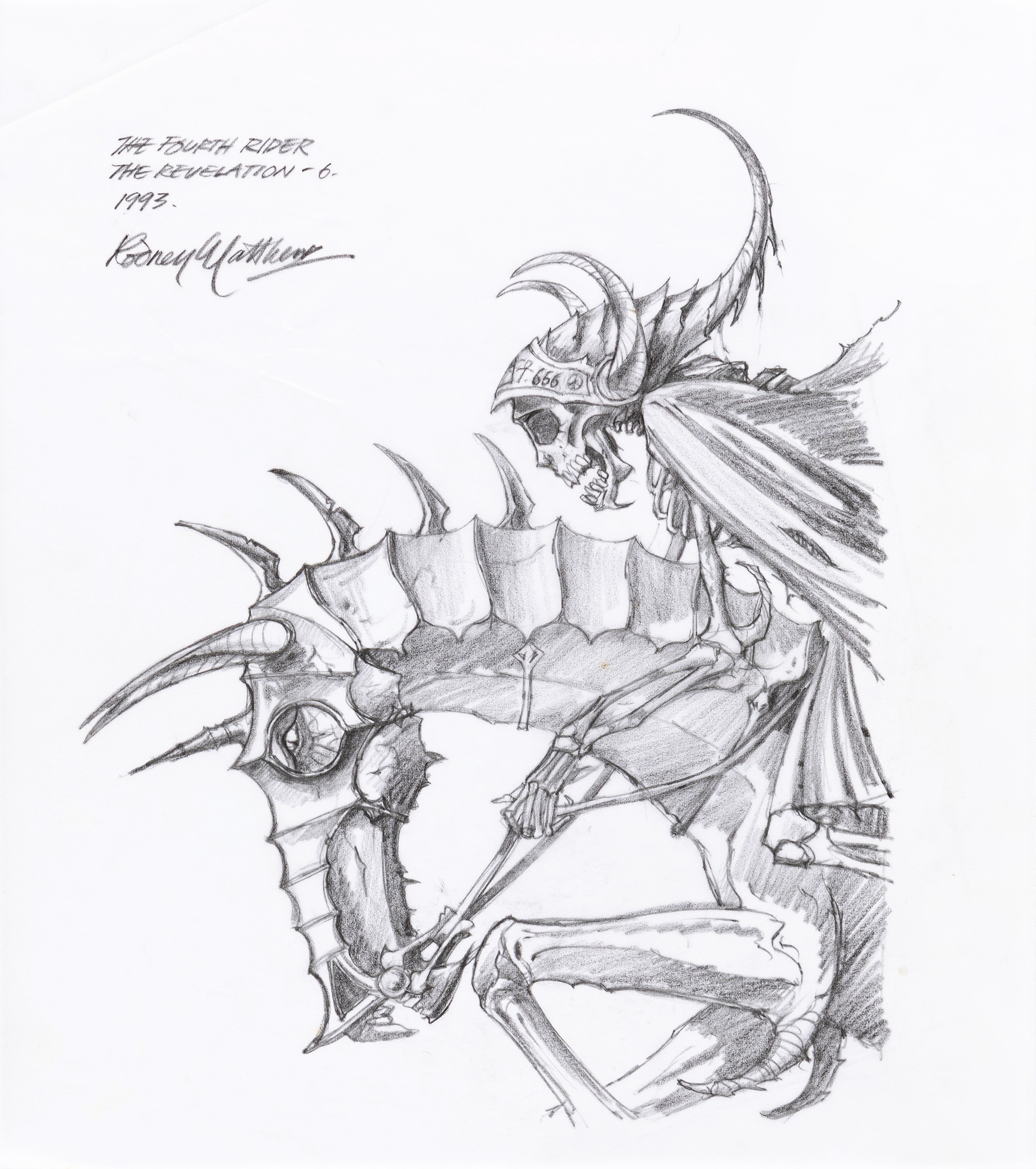matita su lucido, 30 x 34 cm 1993 Disegno preliminare realizzato da Matthews nel 1993 per il dipinto intitolato A Voice Like Thunder, successivamente utilizzato come copertina dell'album Interregnum della band metal Stairway nel 2010. Alcune pieghe. Firmato, datato e titolato.