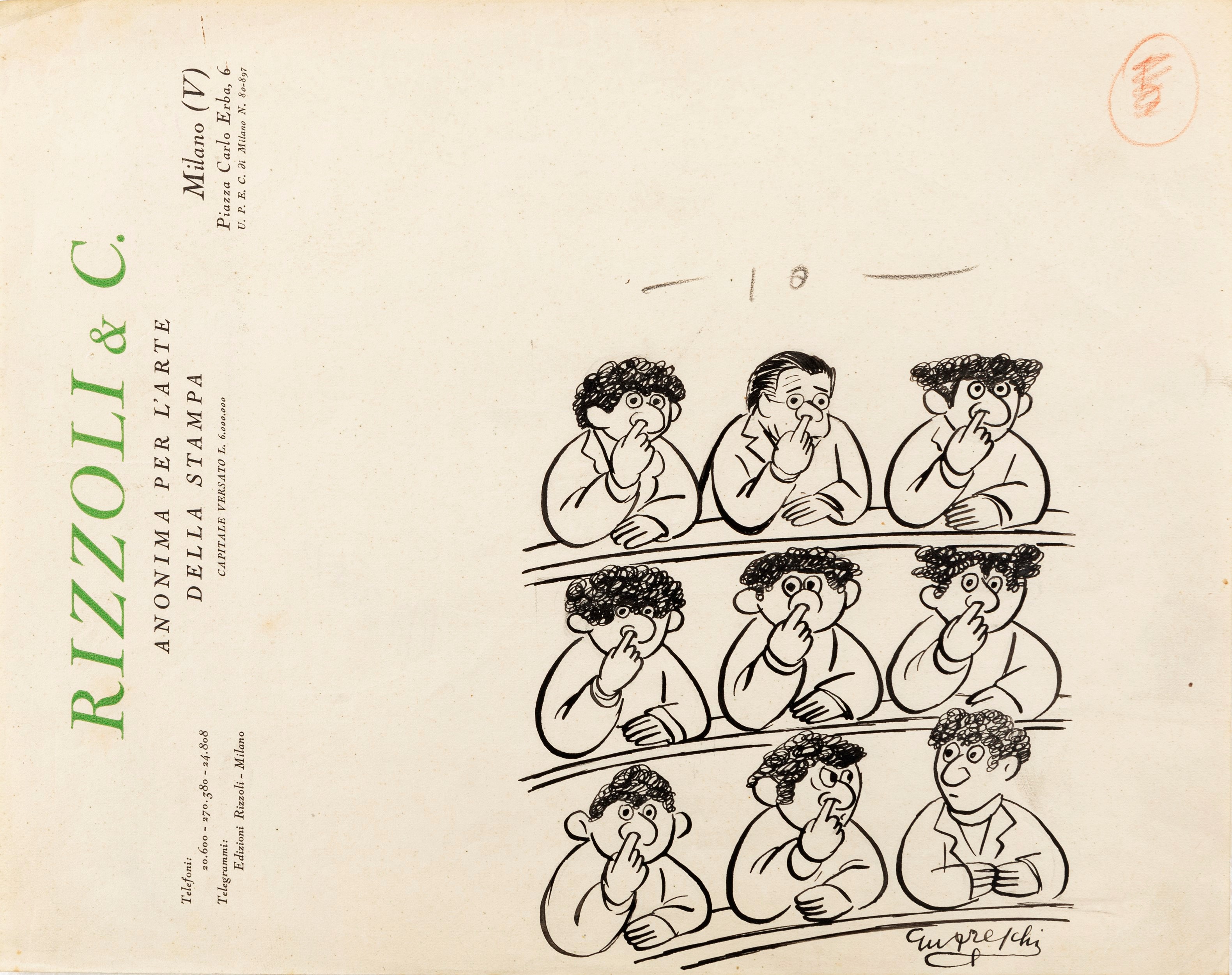 anni '50 Illustrazione originale realizzata da Guareschi su carta intestata della Rizzoli per la celebre rivista Candido di cui fu co-fondatore nel 1945. Lievi pieghe agli angoli. Firmata.