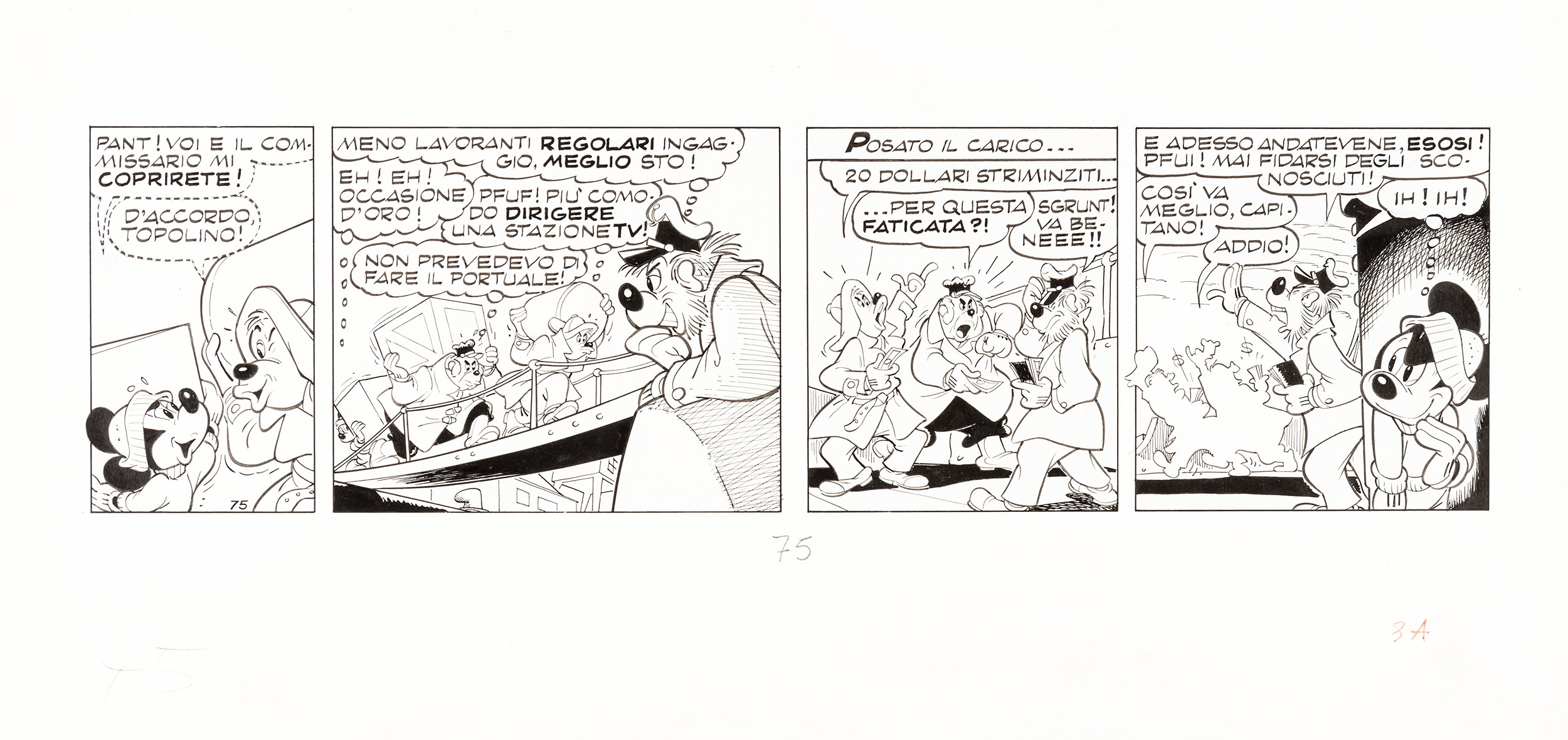 1990 Tavola originale realizzata da Scarpa per la strip-story Topolino e l'enigma di Brigaboom, tav. 75 edita su Topolino n. 1786 nel Febbraio 1990.
