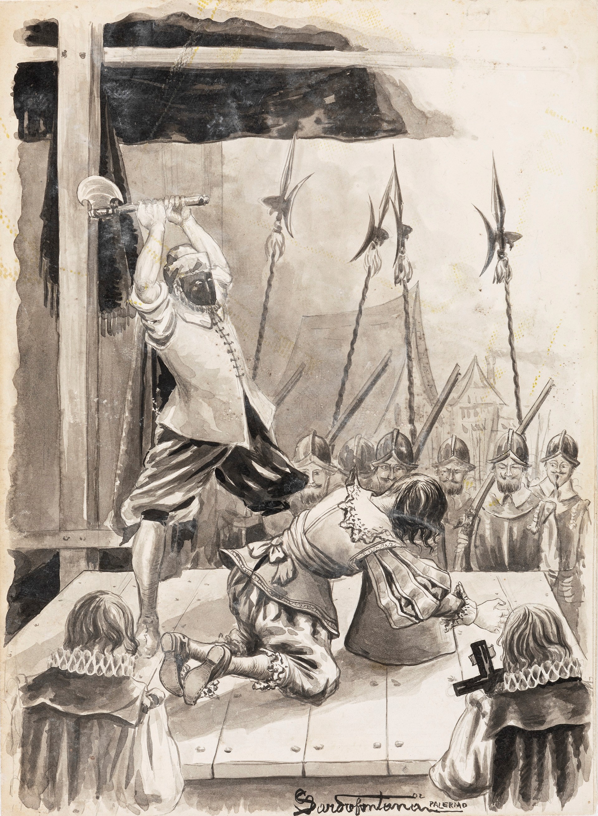 1902 Illustrazione originale realizzata dal pittore palermitano Sardofontana per il romanzo Vent'anni dopo di Alexander Dumas, edito da Enrico Voghera nel 1904. Firmata e datata.