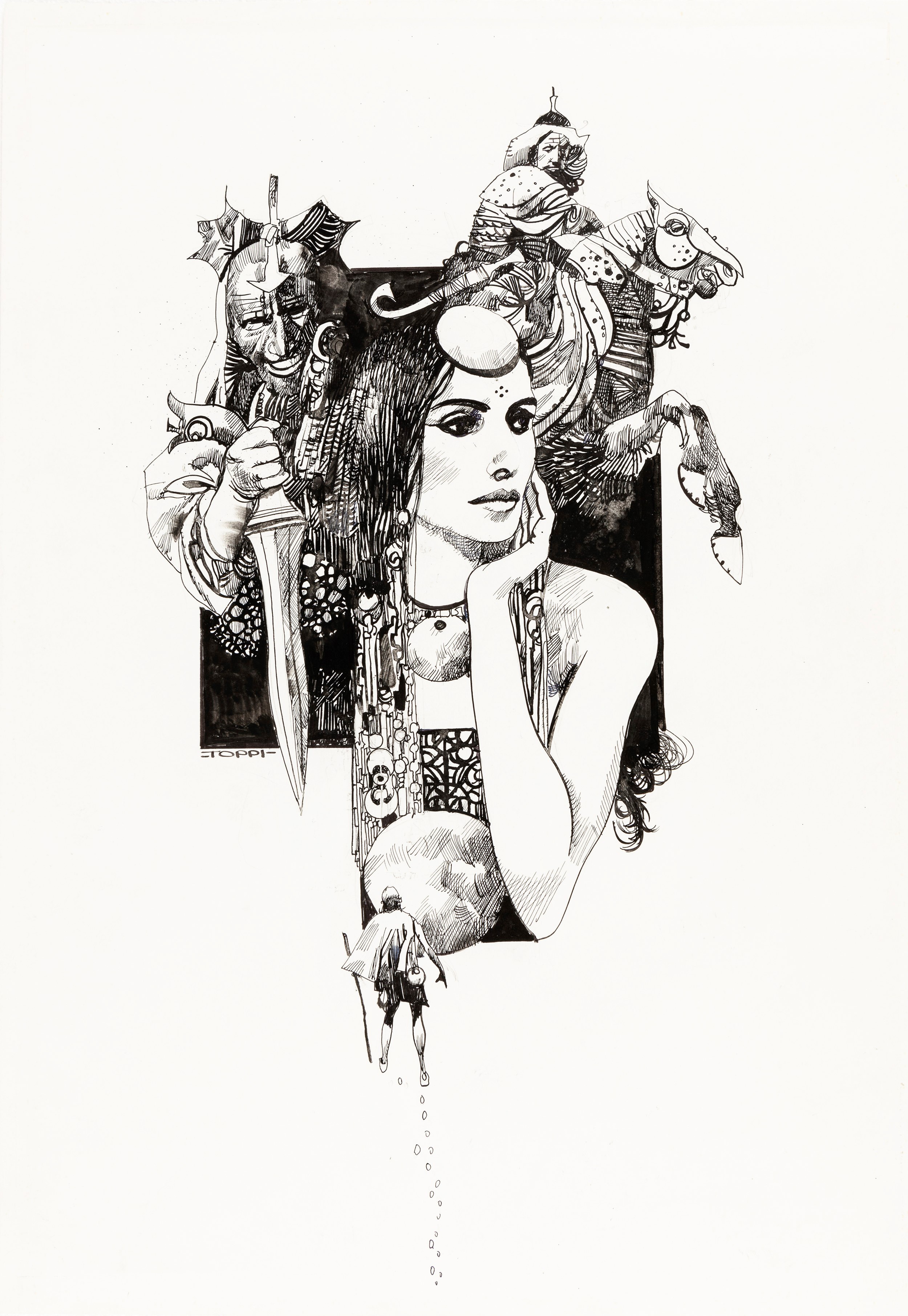 matita e china su cartoncino, 35 x 50 cm 1992 Illustrazione originale realizzata da Toppi per il libro Voci discordi: Sette drammi per la radio di Italo Alighiero Chiusano, edito da Casagrande nel 1992. L'opera illustra il capitolo intitolato Kladek ed è stata utilizzata per la copertina del libro. Firmata.