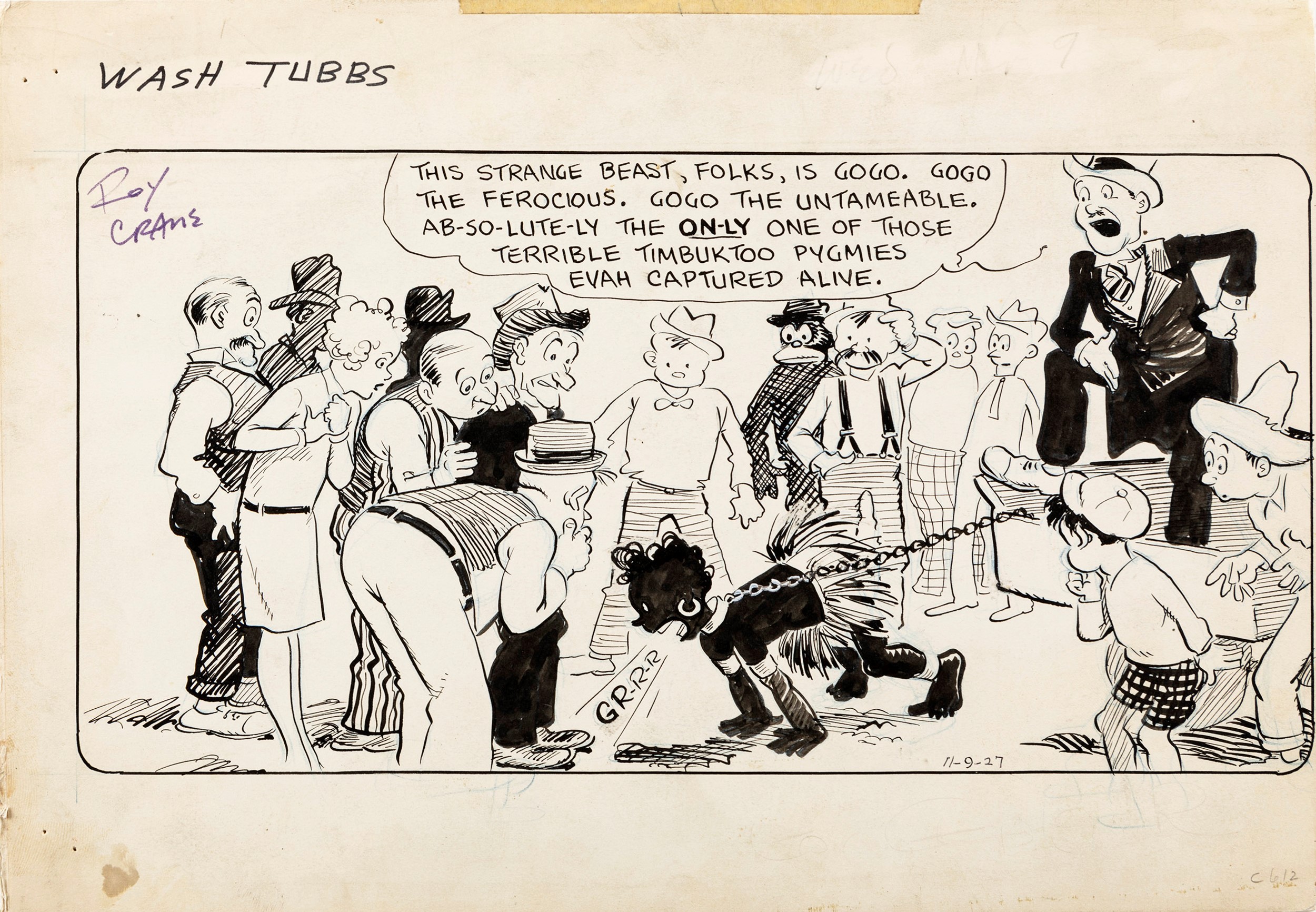 matita e china su cartoncino, 32,5 x 23 cm 1927 Frammento della striscia giornaliera del 09/03/1927 per Wash Tubbs. Creata solo tre anni prima da Crane con il titolo Washington Tubbs II è una delle prime strisce di genere avventuroso, l'ambientazione all'interno di un circo permette al suo autore di concepire questa scena decisamente lontana dal politicamente corretto dei nostri giorni. Fori di affissione agli angoli. Firmata e datata.