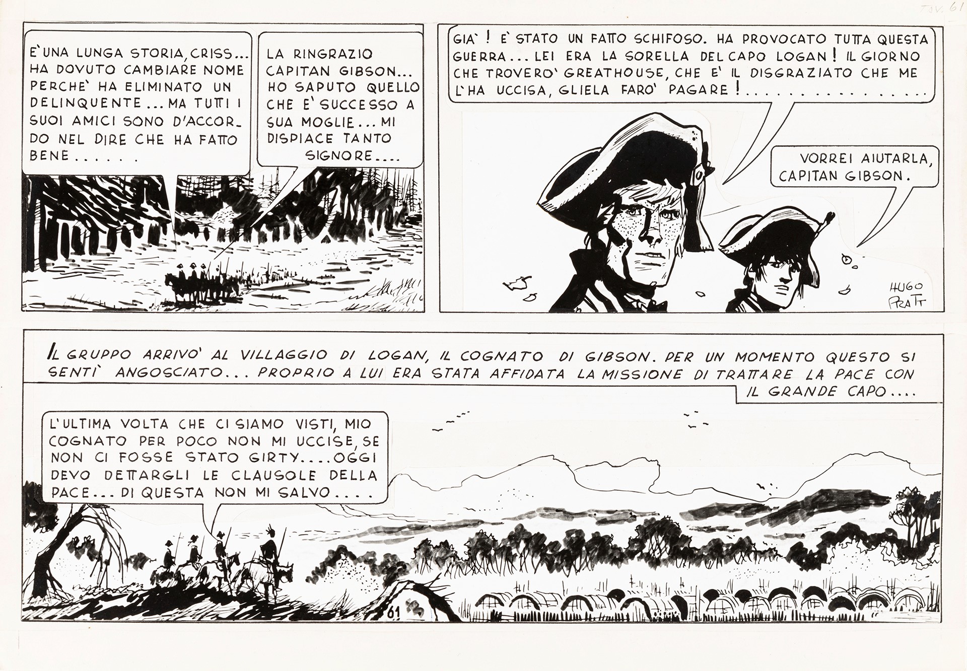 china e pellicola di stampa su cartoncino, 40 x 28 cm anni '70 Prova di stampa per la pag. 61 di Wheeling realizzata da Pratt nei primi anni '70 per la prima pubblicazione italiana ad opera di Ivaldi nel 1972. Pratt decise inizialmente di mantenere un lettering in stile argentino (all'interno di balloon squadrati),
