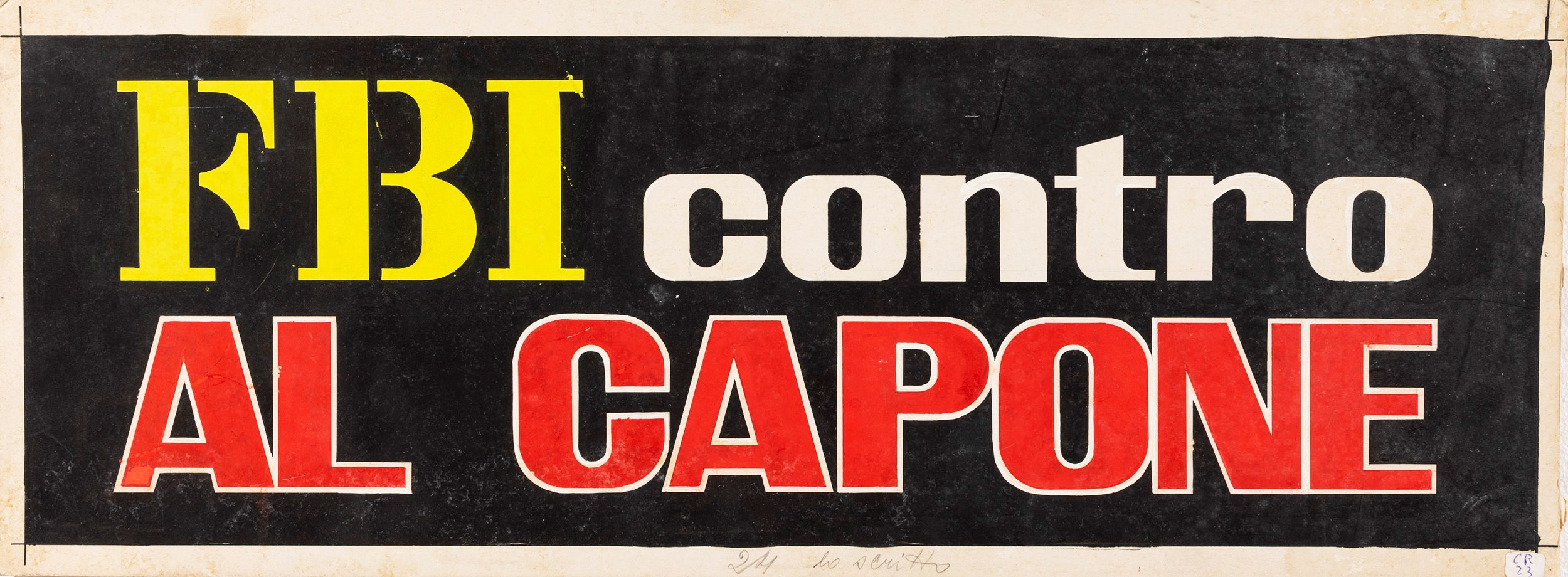 tempera su cartone e pellicola fotografica applicata su cartone, a) 47,5 x 18 cm b-c-d) 25 x 35 cm e)35 x 25 cm 1959 Lotto composto dalla versione italiana del titolo del film F.B.I. contro Al Capone diretto da Phil Karlson con Robert Stack, Neville Brand e Barbara Nichols nel 1959 e da 4 flani fotografici (immagine promozionale destinata a giornali e sale cinematografiche).