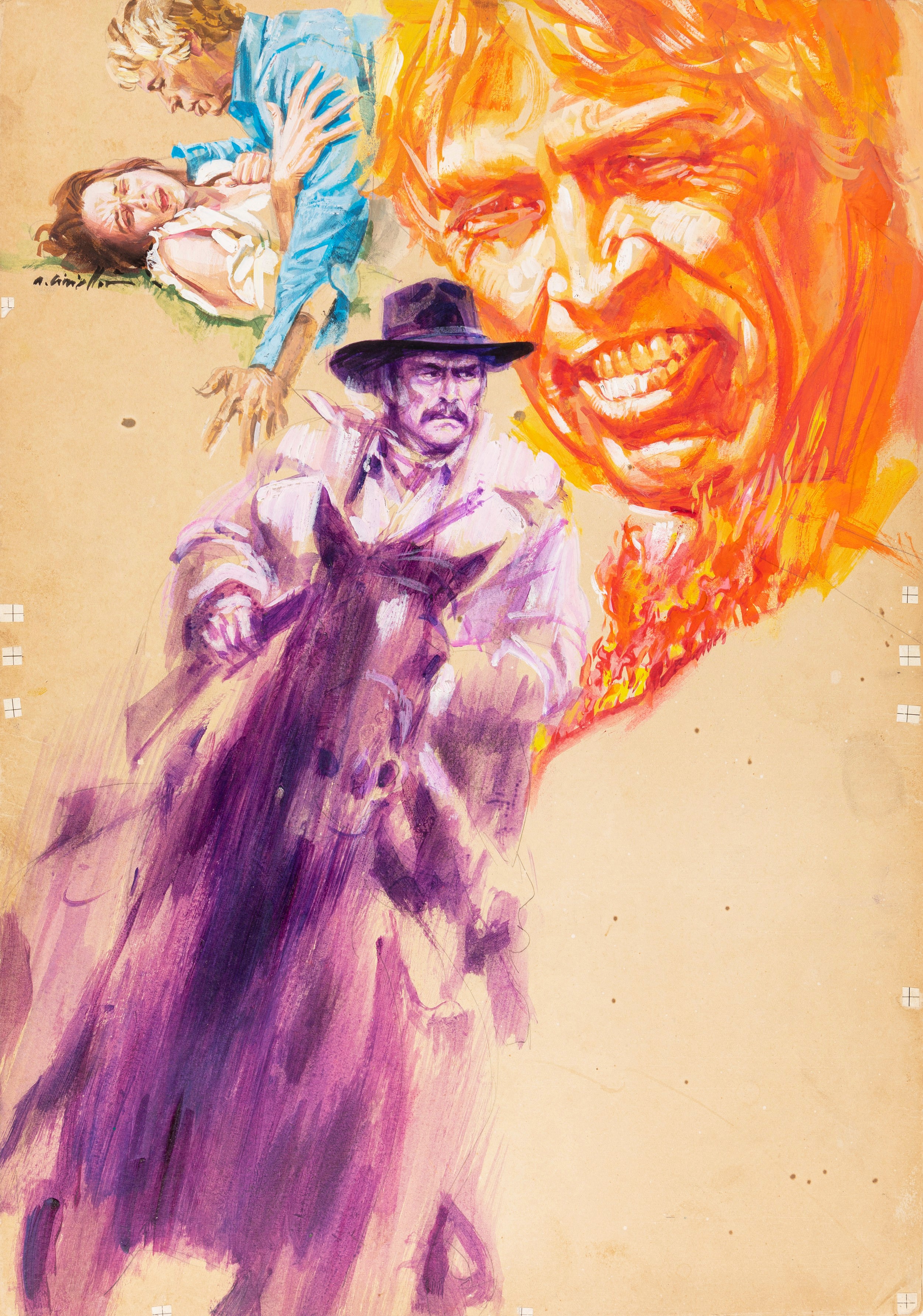 matita e tempera su cartone, 34,5 x 49,5 cm 1976 Bozzetto originale realizzato da Ciriello per la locandina ufficiale del film Gli ultimi giganti, diretto da Andrew V. McLaglen con Charlton Heston, James Coburn e Barbara Hershey nel 1976. Lieve piega all'angolo inferiore destro. Firmato.