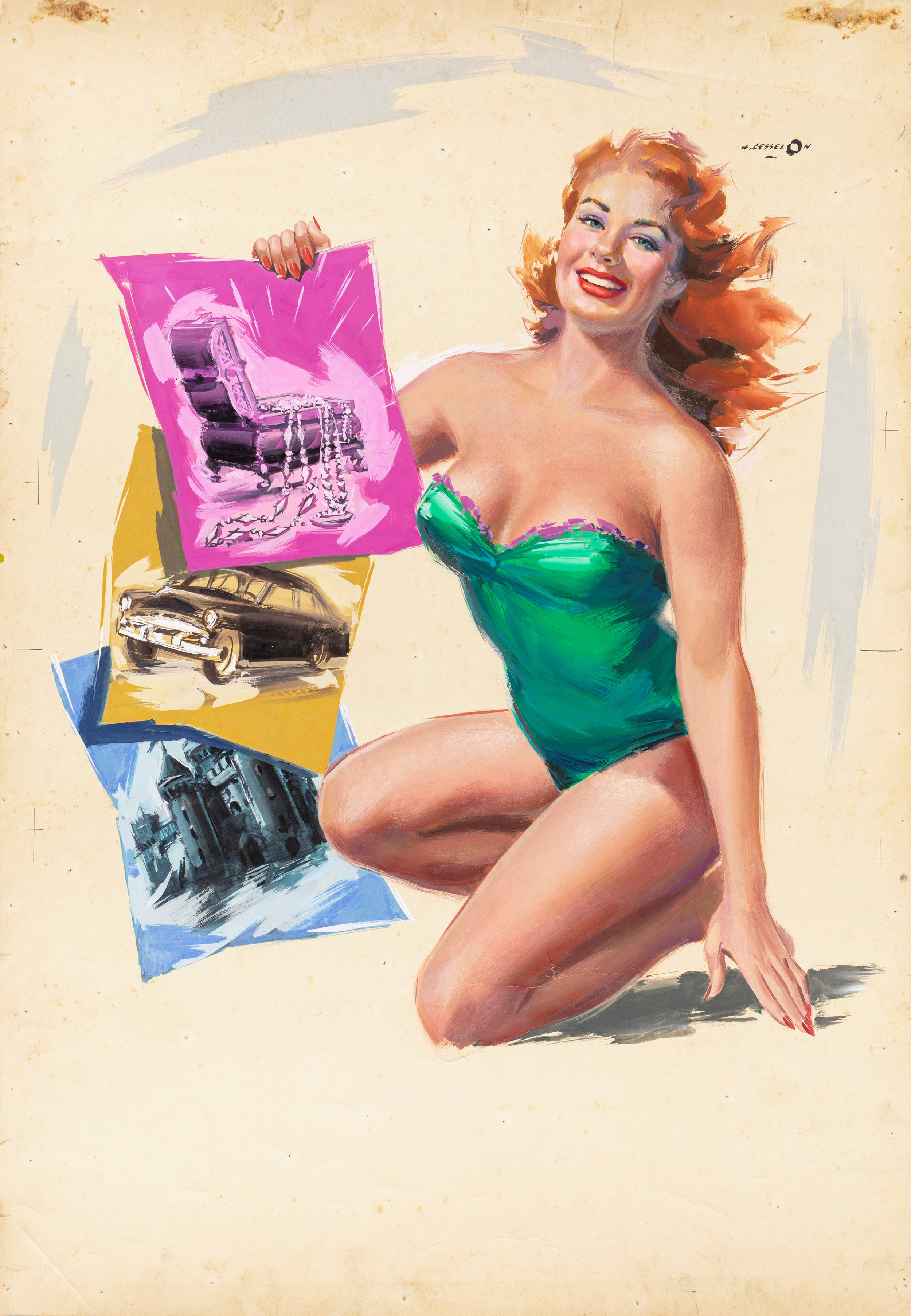 tempera su cartoncino, 70 x 100 cm 1959 Bozzetto originale realizzato da Cesselon per la locandina ufficiale del film Le donne ci tengono assai, diretto da Antonio Amendola con Mara Berni e Pierre Cressoy nel 1959. Lievi pieghe, piccoli strappi e pieghe ai margini. Firmato.