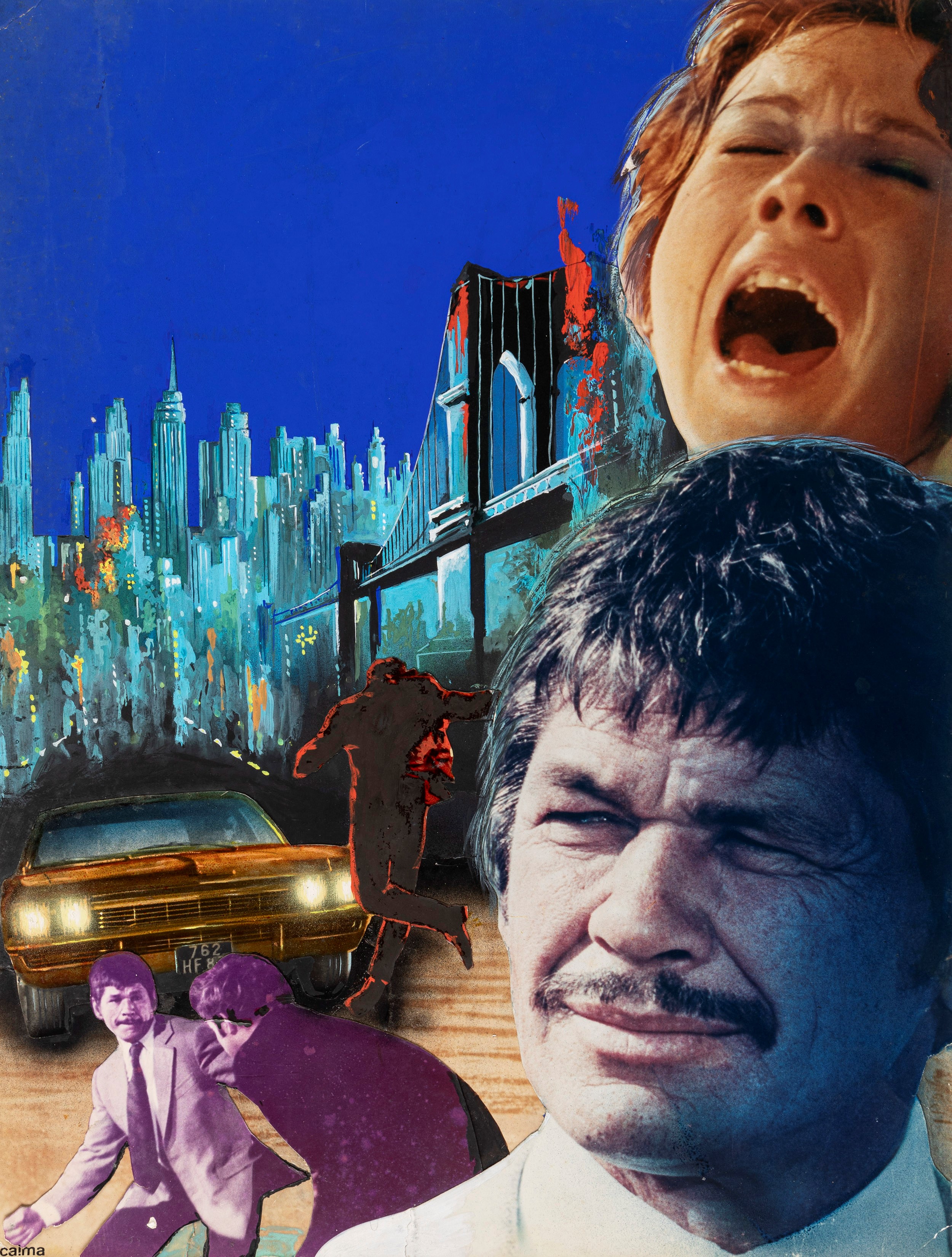 tempera e collage fotografico su cartone, 33 x 43,5 cm 1970 Bozzetto originale realizzato da Calma per la locandina ufficiale del film L'uomo venuto dalla pioggia, diretto da René Clément con Charles Bronson, Marlène Jobert e Gabriele Tinti nel 1970. Lievi pieghe agli angoli. Firmato.