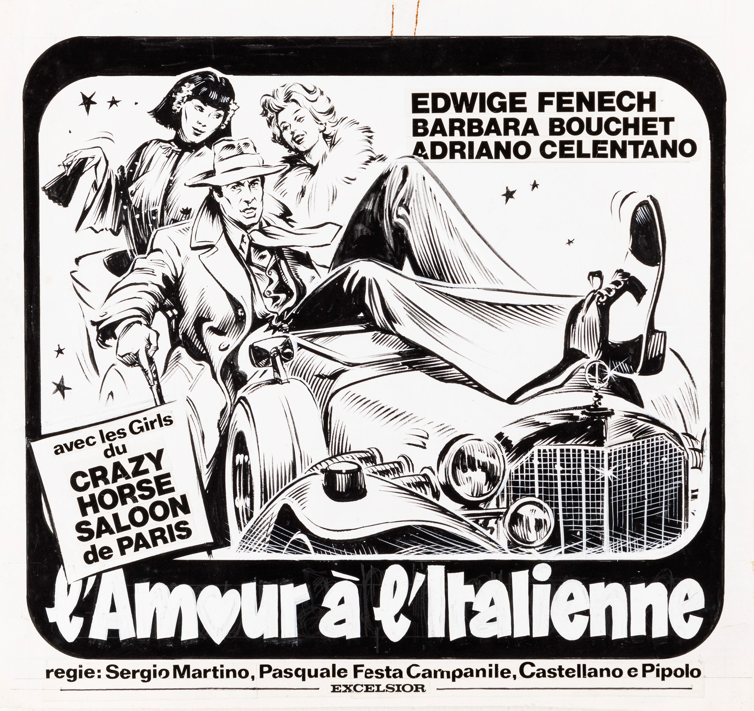china e biacca su cartoncino, 24,5 x 23 cm 1979 Bozzetto originale per il flano francese (immagine promozionale destinata a giornali e sale cinematografiche) del film Sabato, domenica e venerd́, diretto da Castellano e Pipolo con Adriano Celentano, Edwige Fenech e Barbara Bouchet nel 1979.