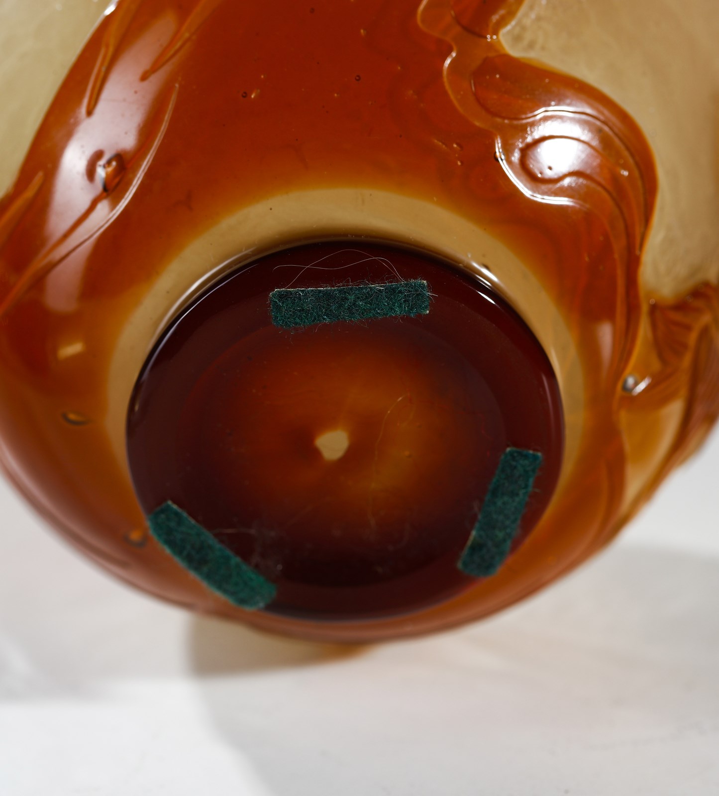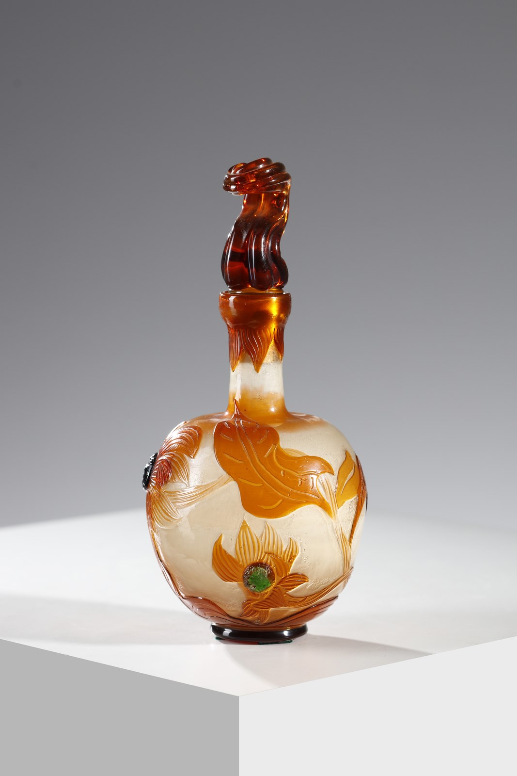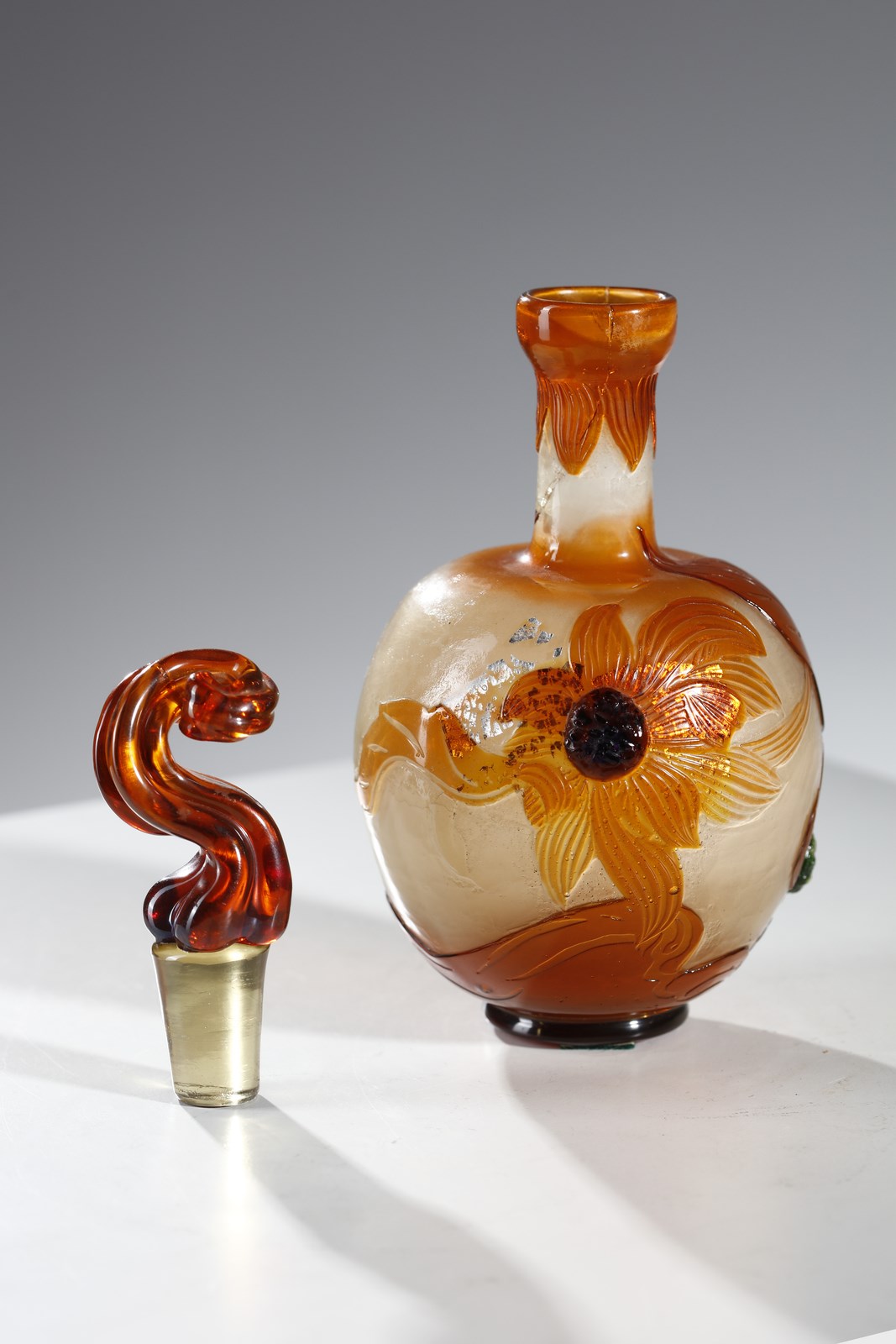 Ampolla in vetro con decoro floreale nei toni dell'arancio e del rosso su fondo [..]