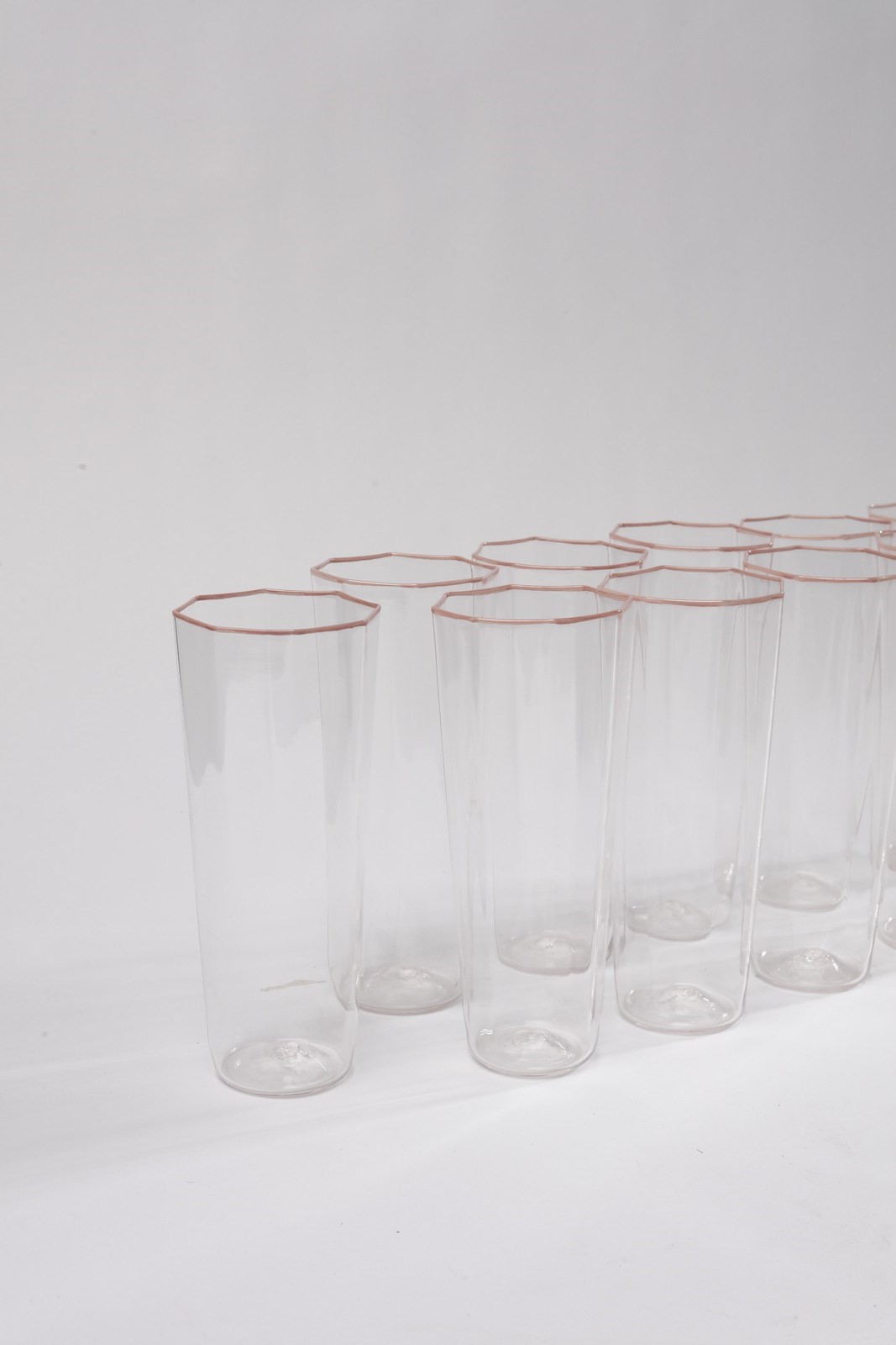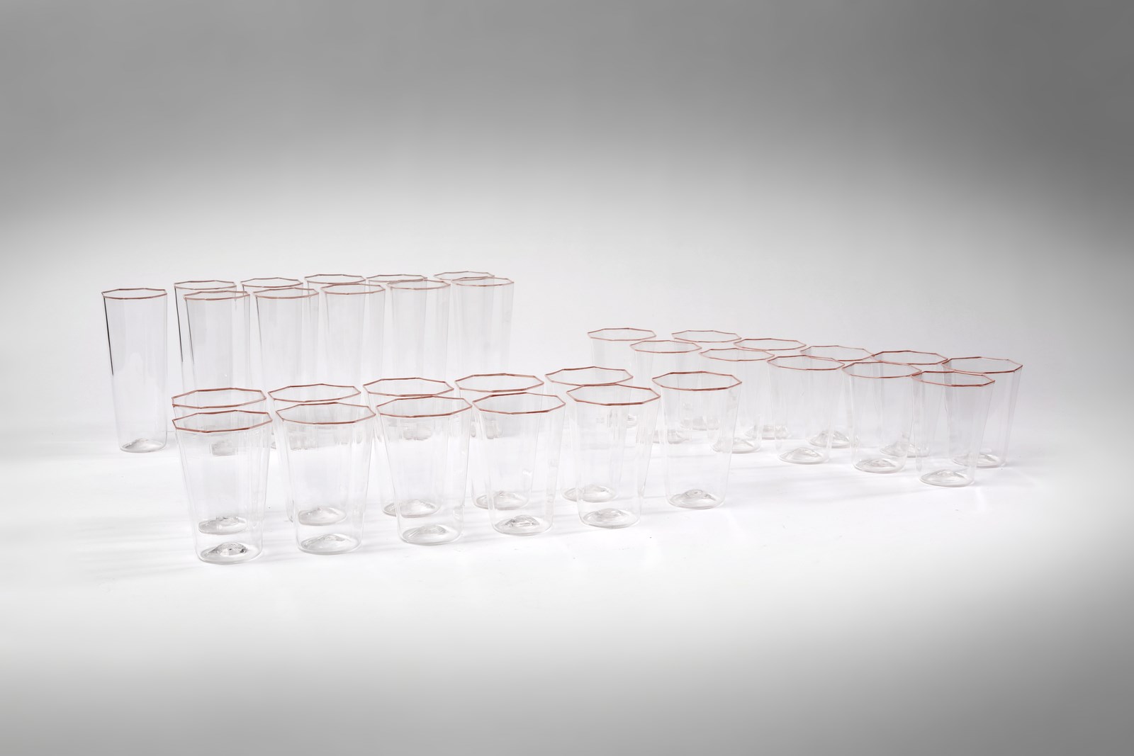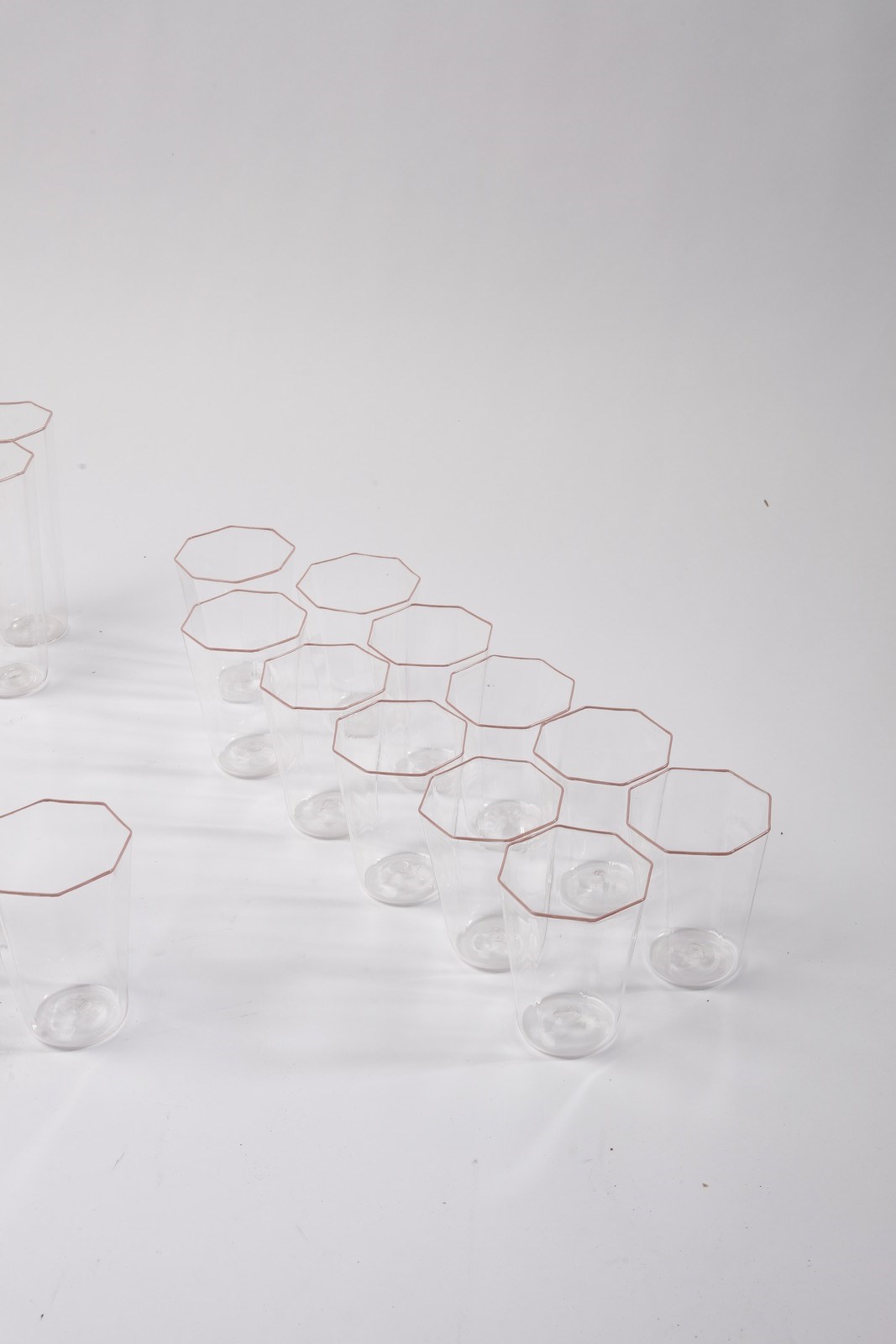 attribuito.Trentatre bicchieri in vetro trasparente a sezione ottagonale. Bocca [..]
