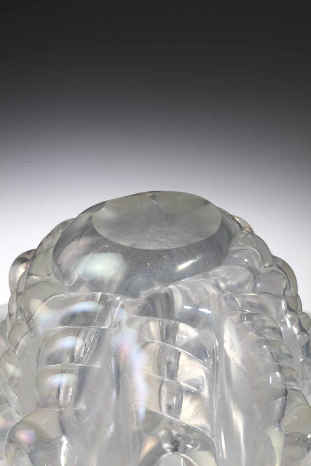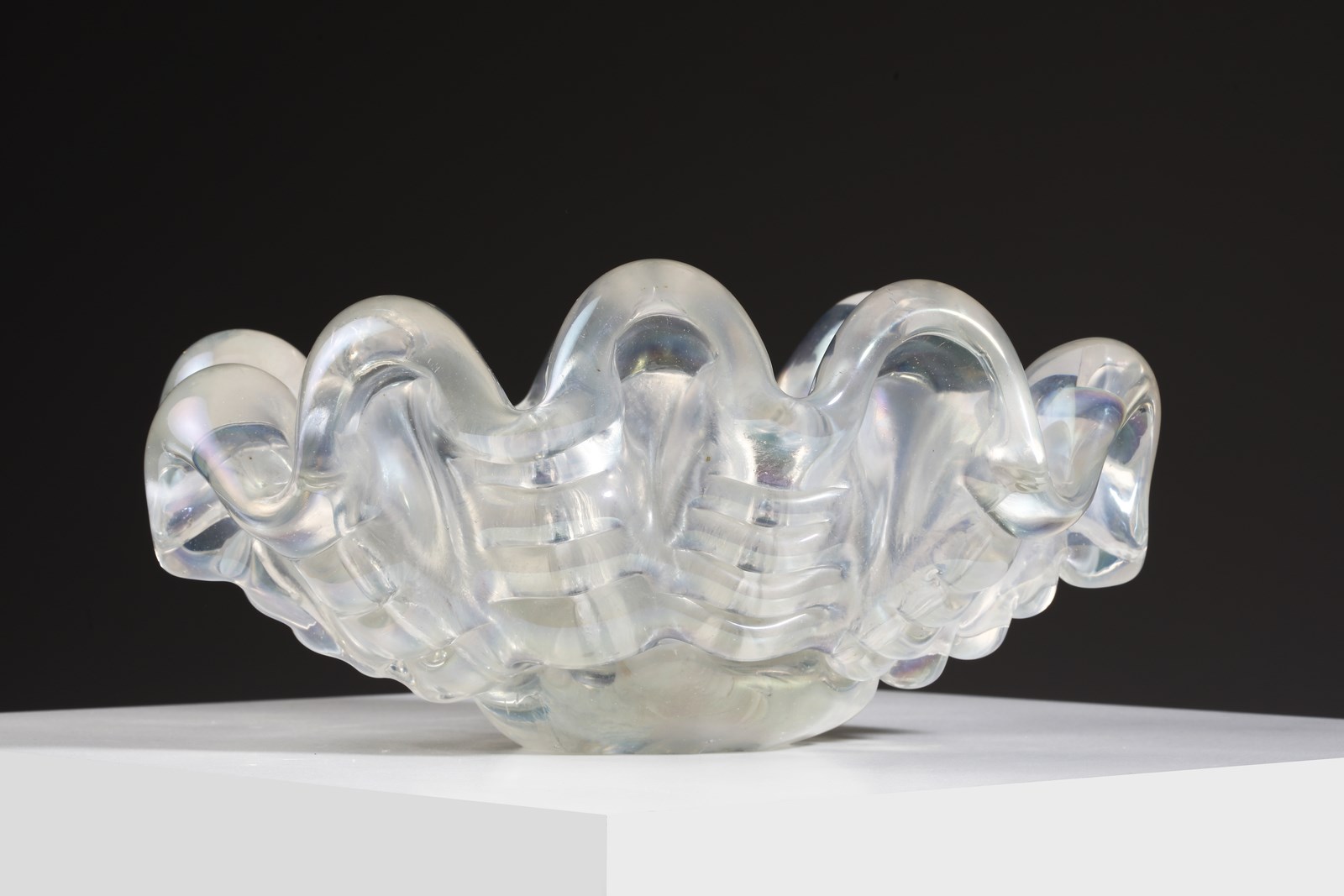Centrotavola in vetro trasparente a grosse costolature. Superficie iridata