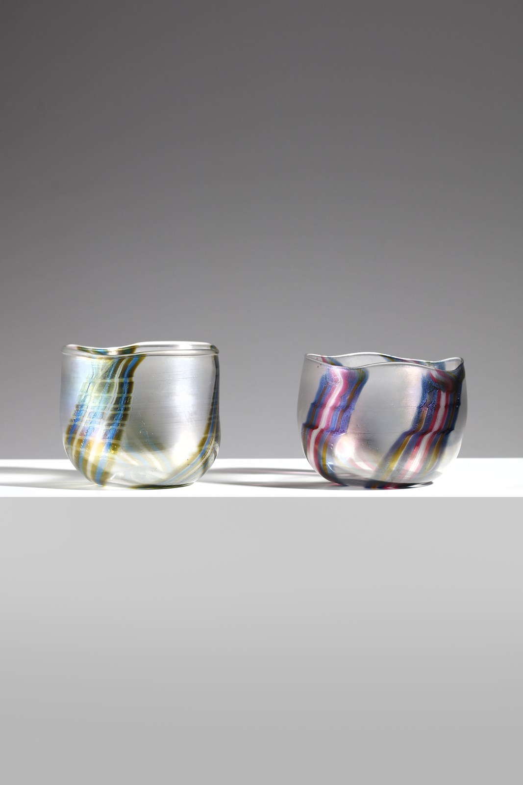 Coppia di vasi decorati a canne colorate. Superficie iridata