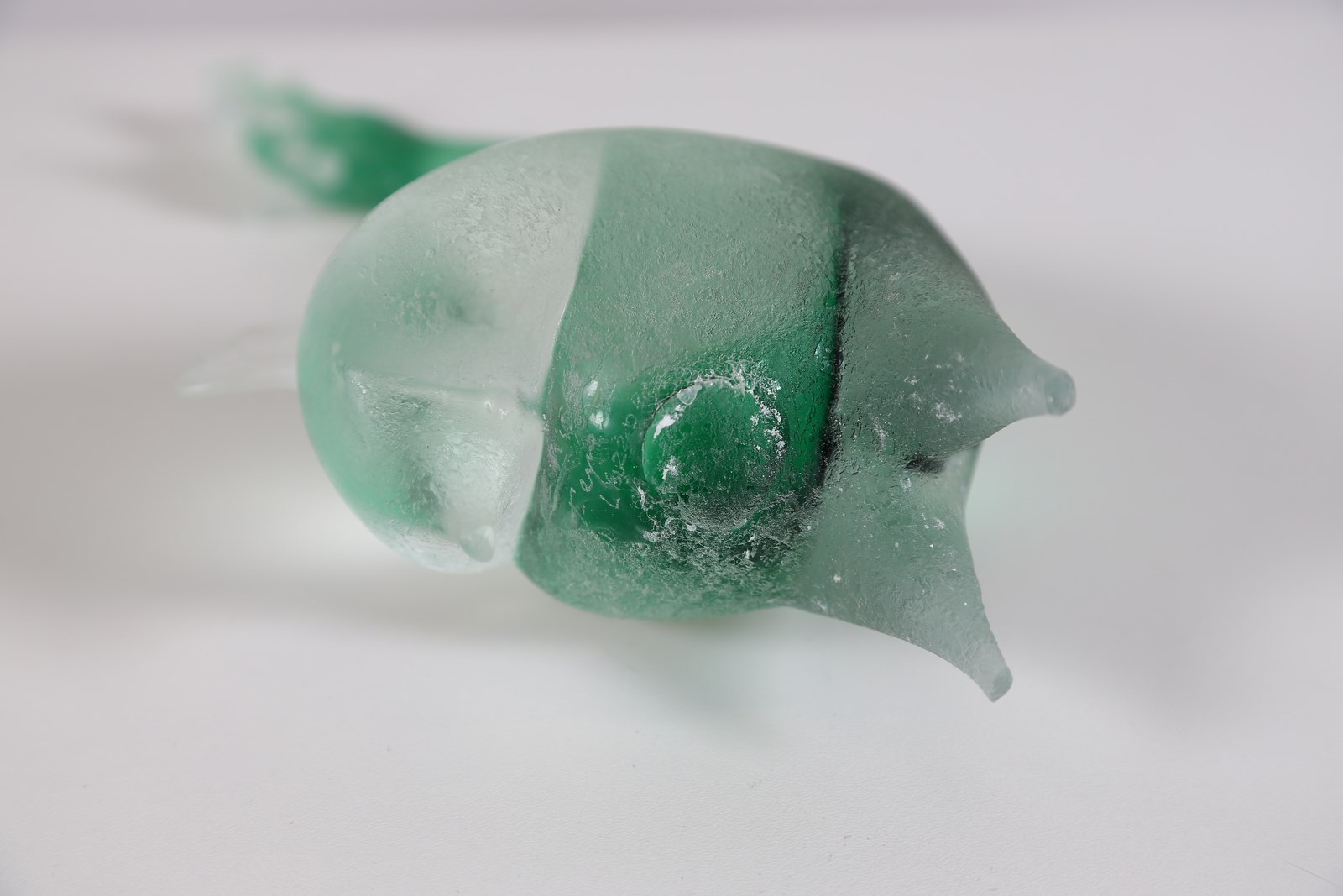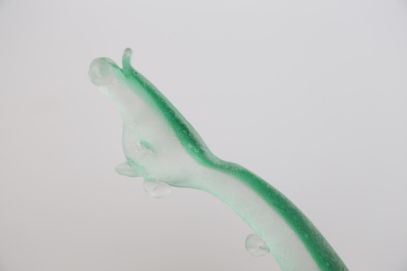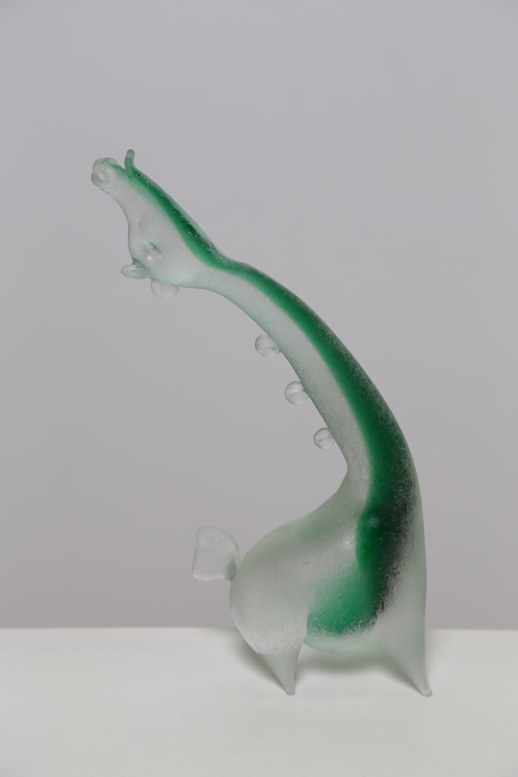 Figura di giraffa in vetro trasparente sommerso in verde, superficie corrosa