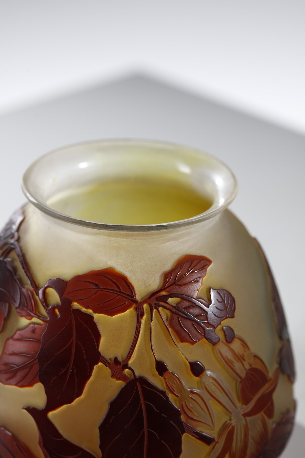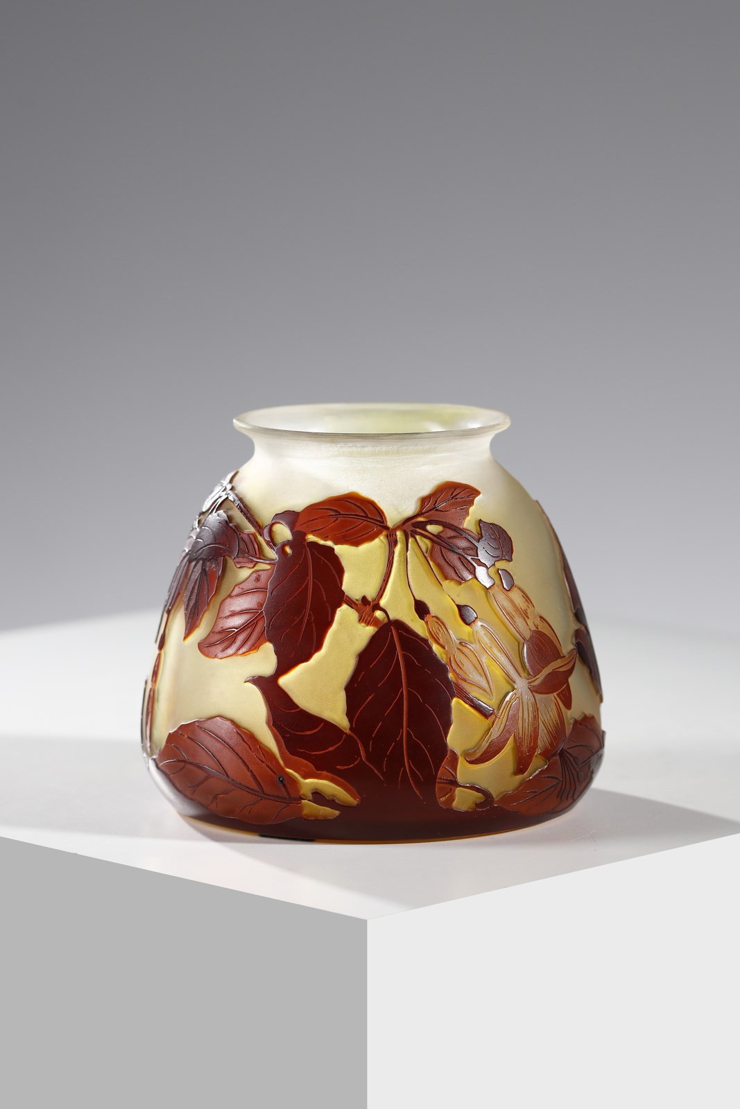 Piccolo vaso in vetro doppio, con decoro di foglie nei toni del bruno, finemente [..]