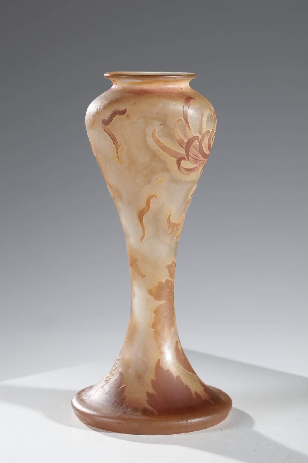 Vaso a balaustro riposante su base circolare, con decoro vegetale nei toni dell'arancio, [..]