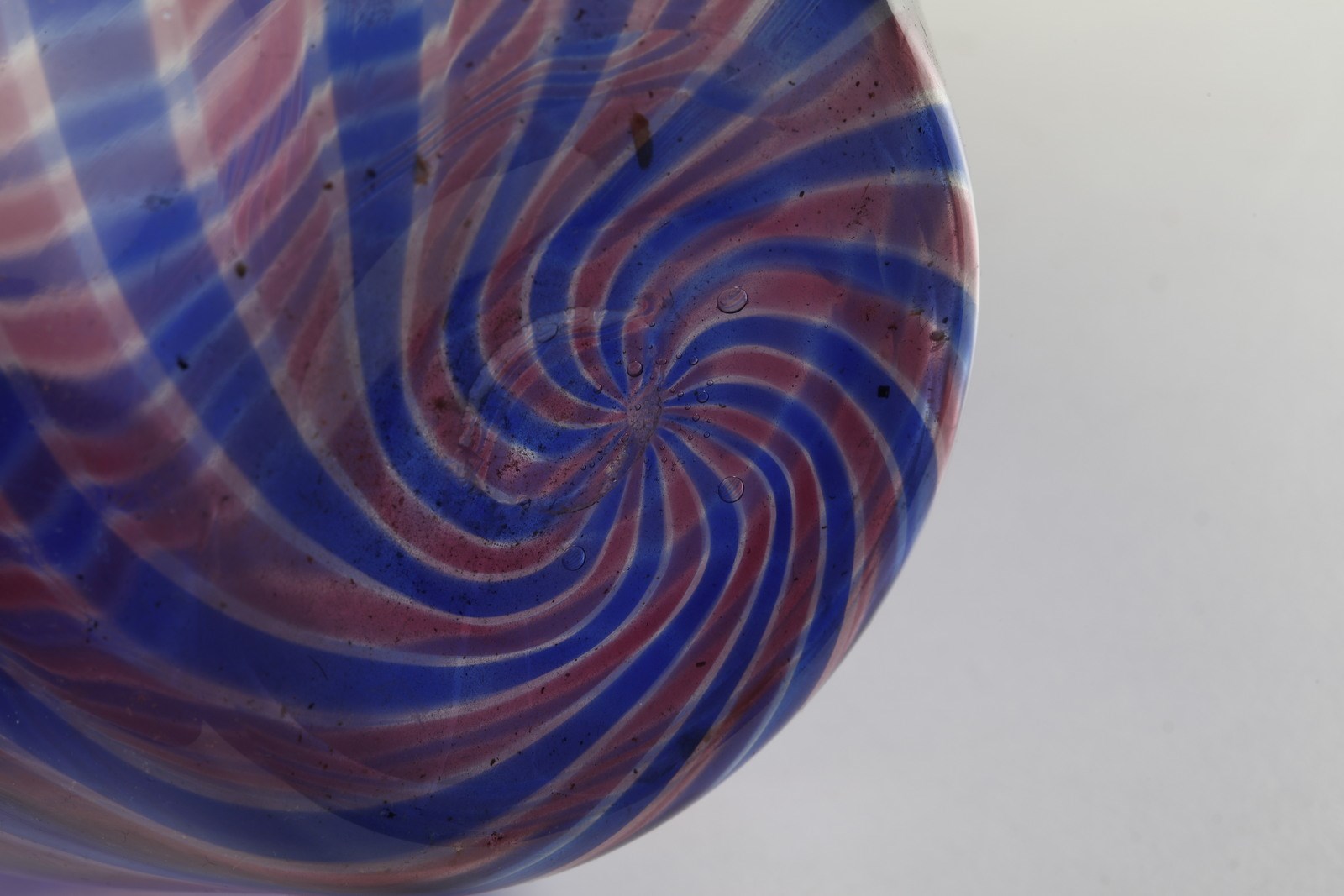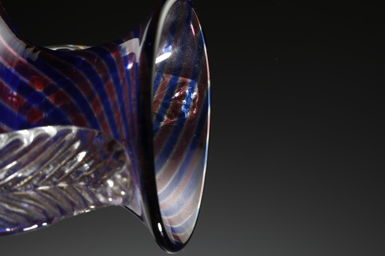 Vaso a fasce ritorte ametista e blu, manici applicati in vetro trasparente