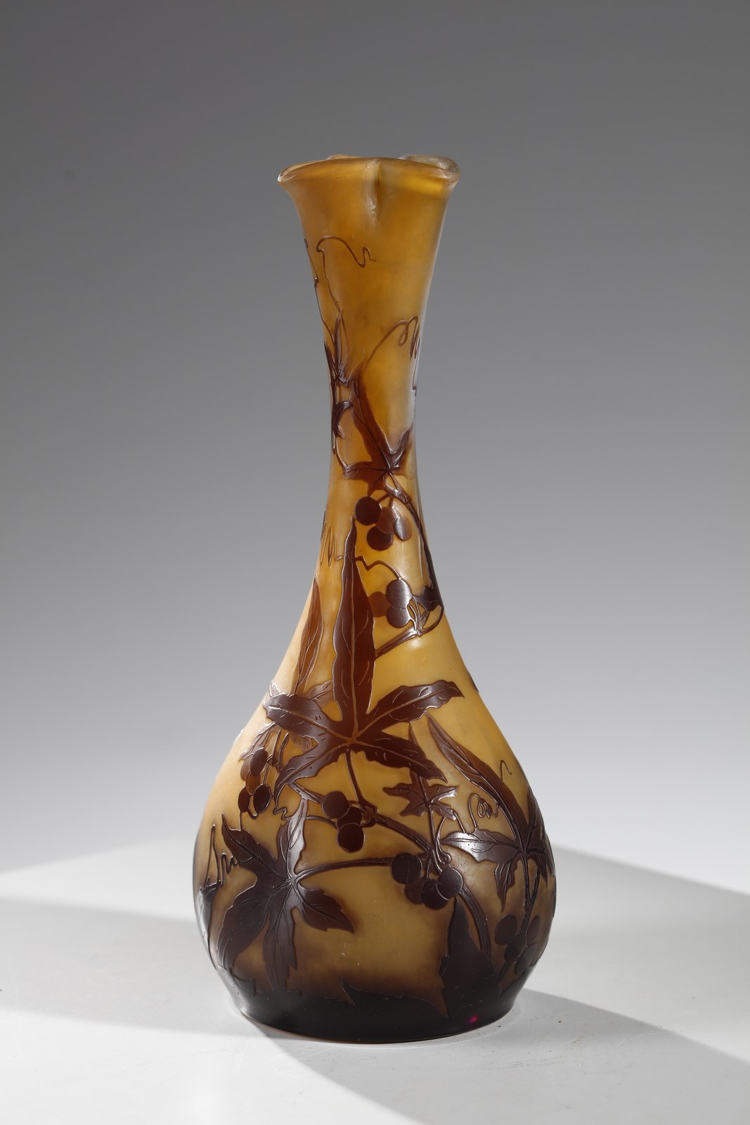 Vaso in vetro doppio, con decoro di foglie nei toni del bruno, finemente inciso [..]