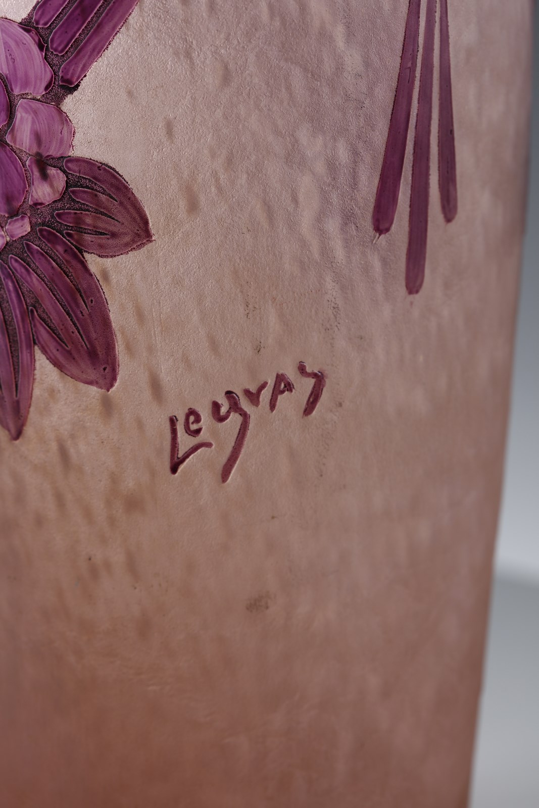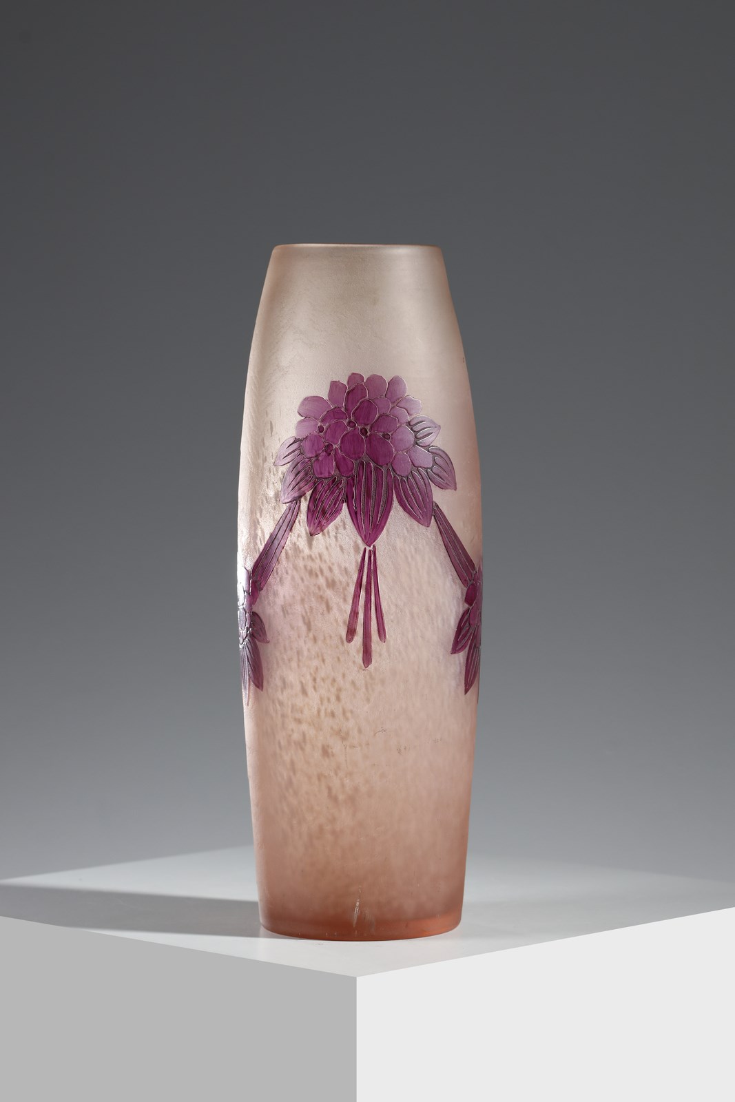 Vaso in vetro doppio nei toni del rosa con decoro di fiori viola