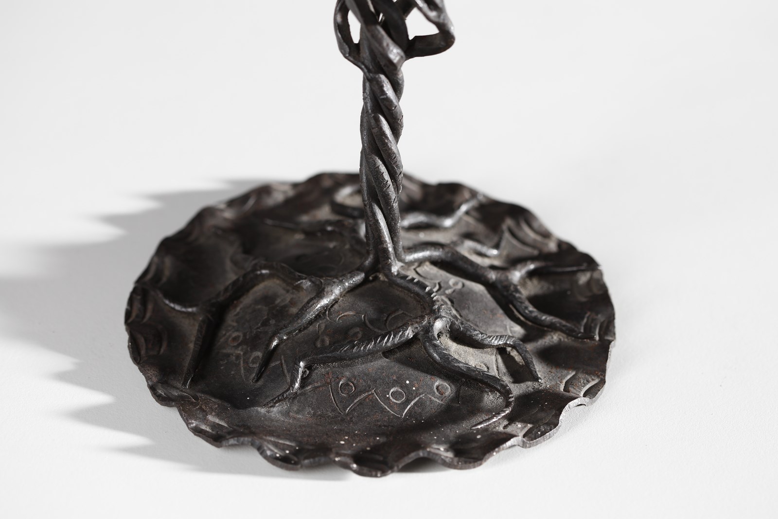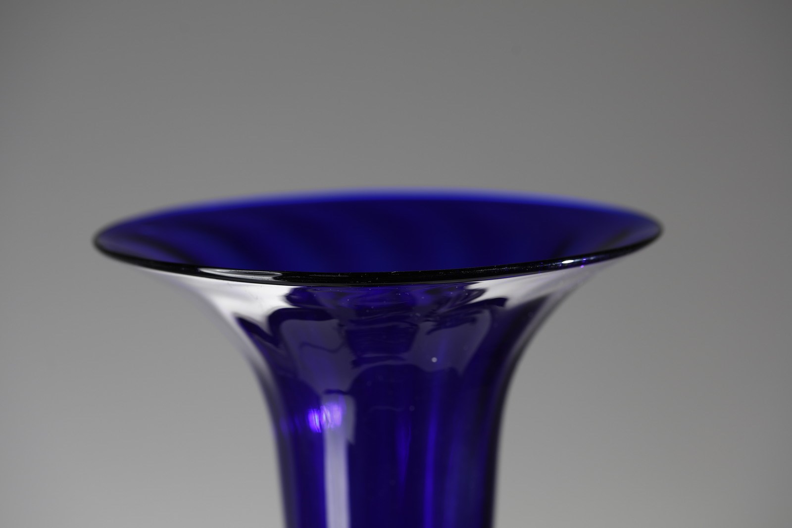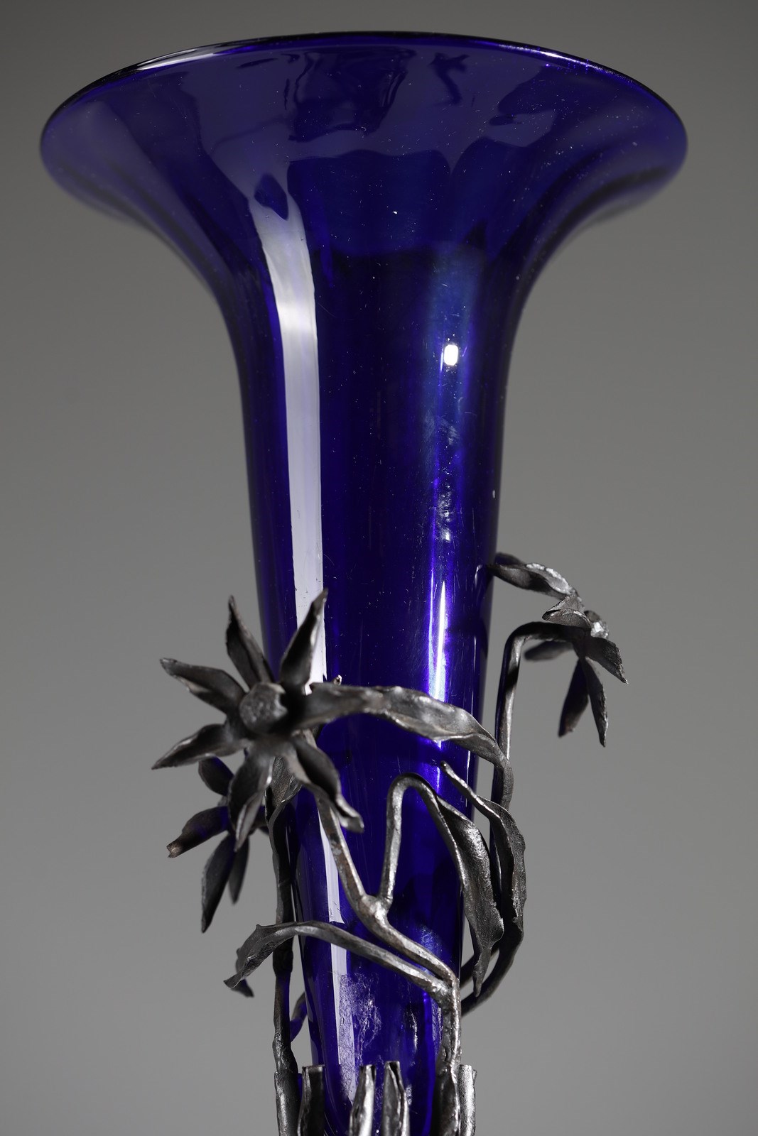 Vaso in vetro trasparente blu inserito in struttura in ferro battuto