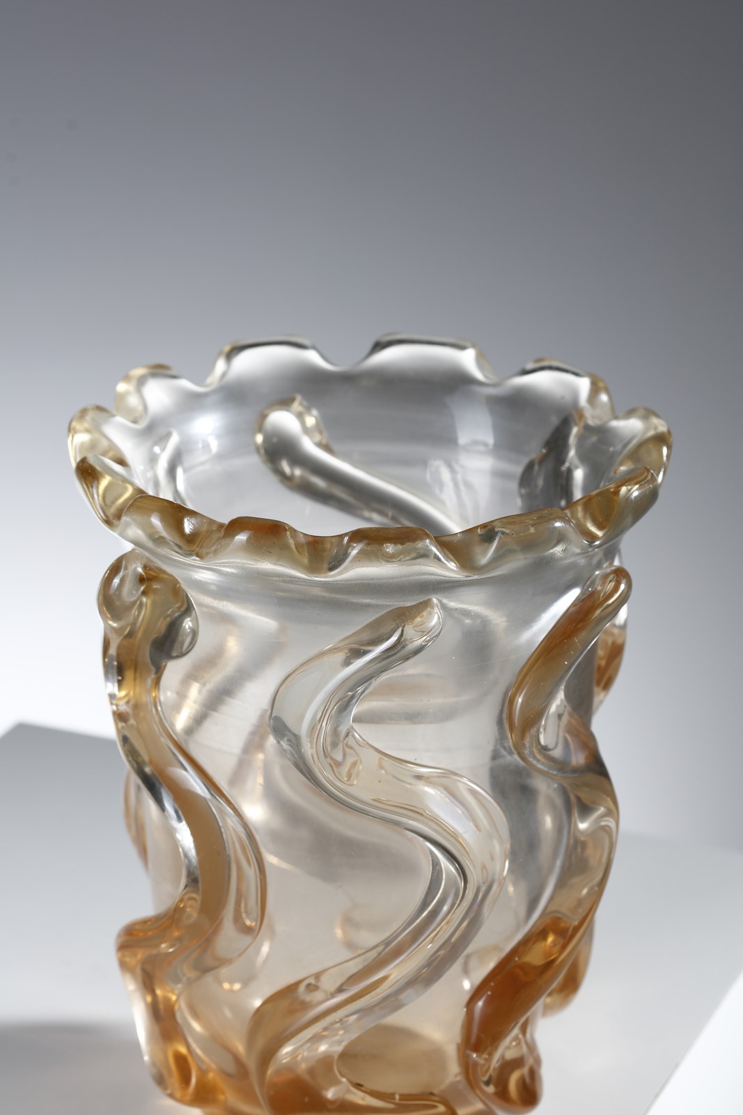 Vaso in vetro trasparente color ambra decorato con applicazioni