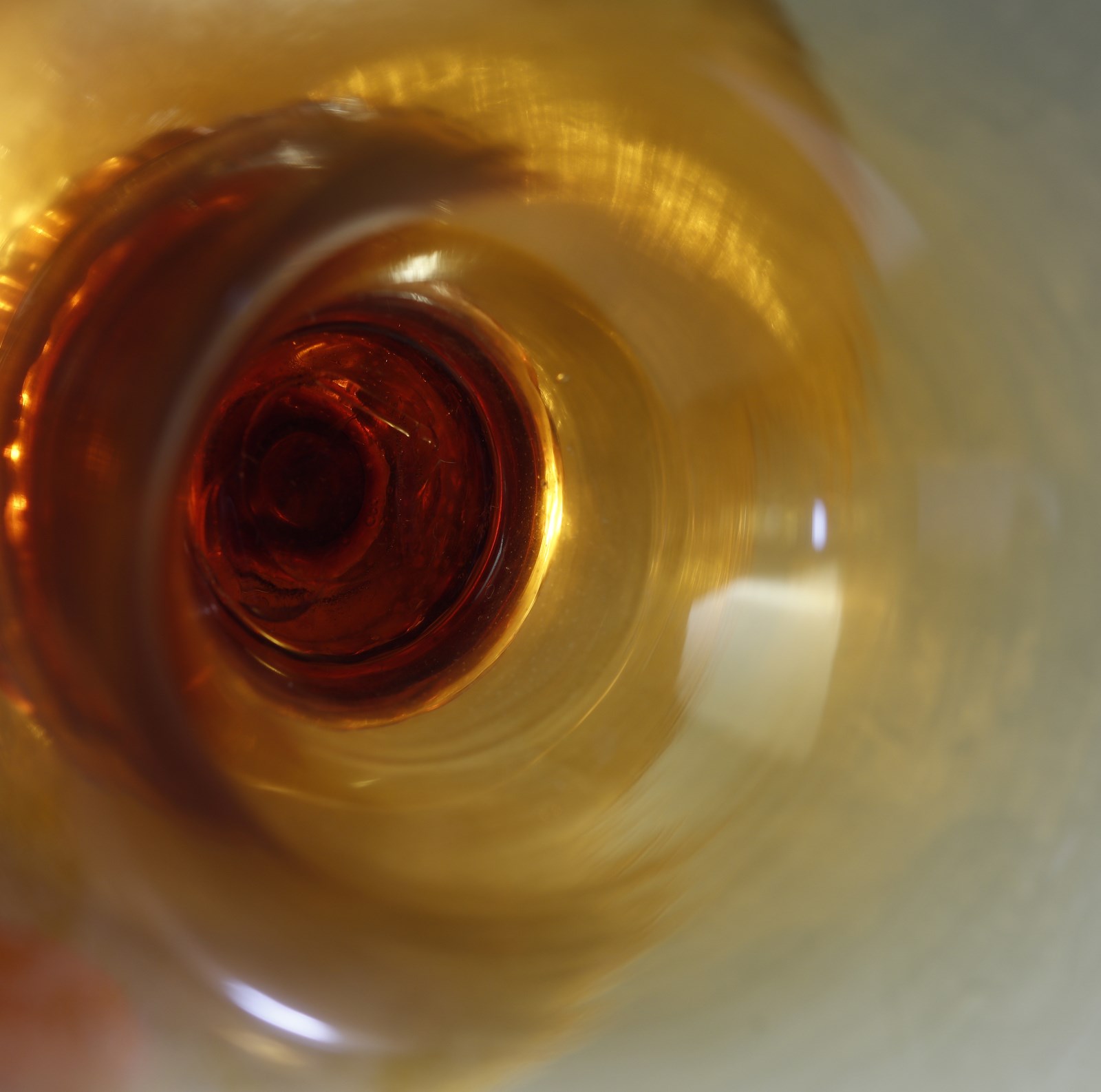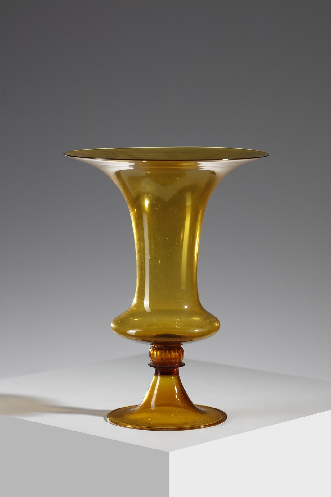 Vaso in vetro trasparente color ambra, piede a disco e nodo costolato