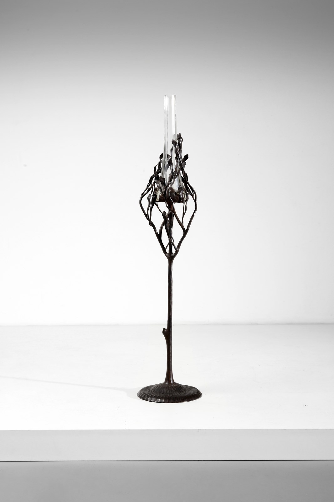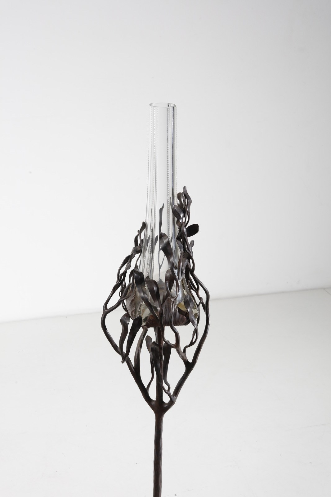 Vaso in vetro trasparente inserito in struttura in ferro battuto